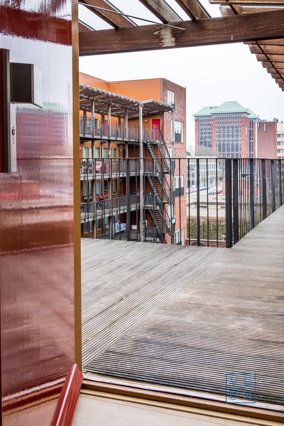 Hof van Hoytema is a spacious apartment complex in Amsterdam. The red-brick building, with its warm wooden heart of verandas, balconies, and staircases surrounding a striking inner courtyard, was designed by Heren 5 architects and completed in 2003.