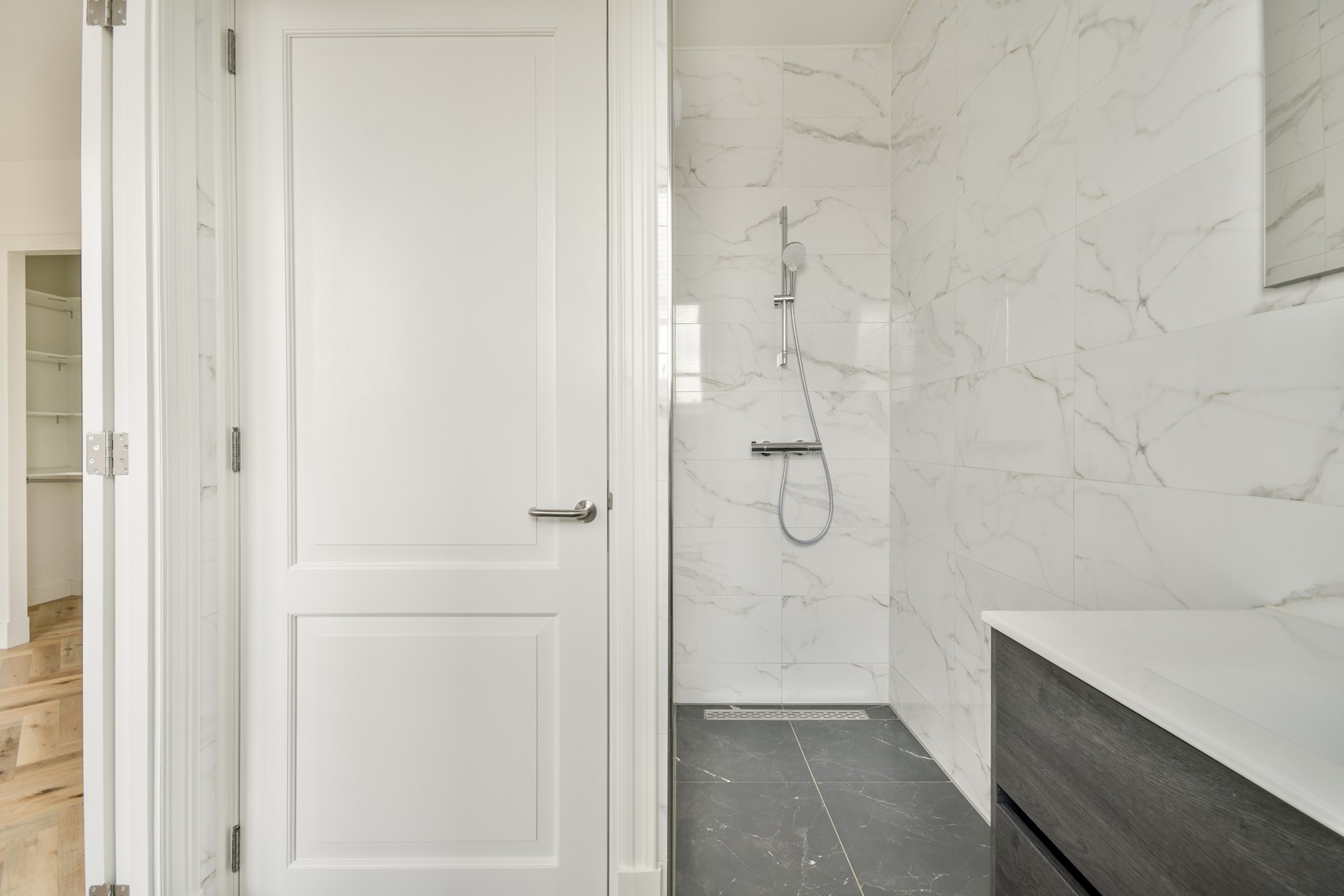 At the front is the bedroom with an en-suite bathroom. The bathroom has a walk-in shower and sink. The entire floor is fitted with a new herringbone PVC floor, and the apartment is fully floor heated.