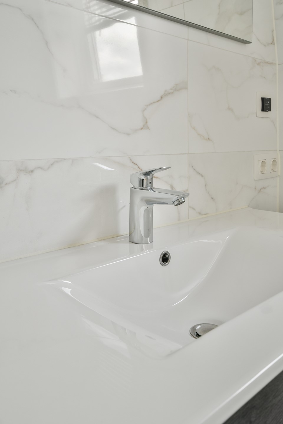 Aan de voorzijde ligt de slaapkamer met een en-suite badkamer. De badkamer heeft een inloopdouche en wastafel. De gehele etage is voorzien van een nieuwe visgraat pvc vloer en de woning is volledig vloer verwarmd.