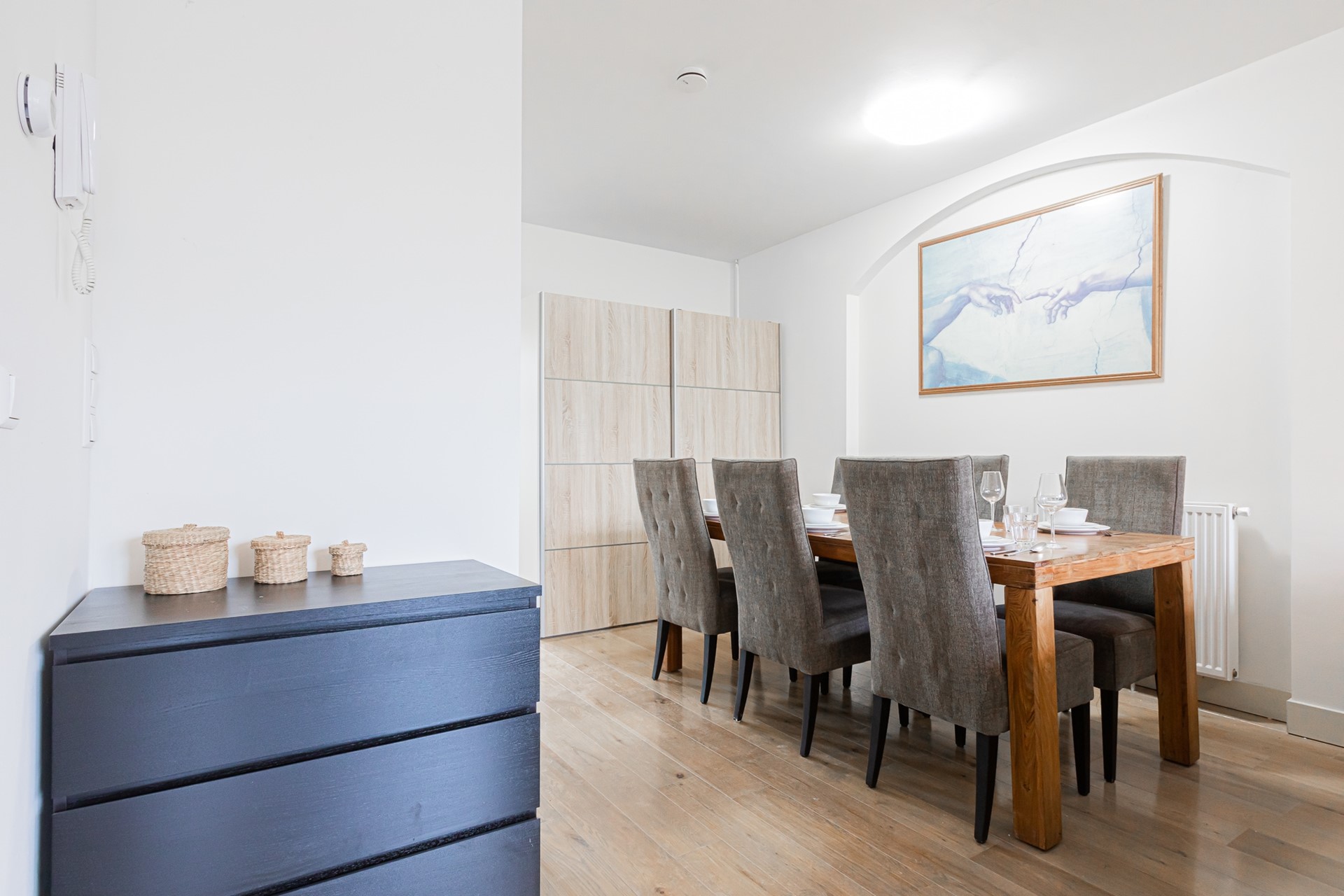 Entrance is through the common stairwell on the third floor. The bright living room has large windows that bring in lots of natural light. The open kitchen is fully equipped. Both bedrooms are furnished with a double bed and closet. The bathroom consists of a shower, sink and toilet.
