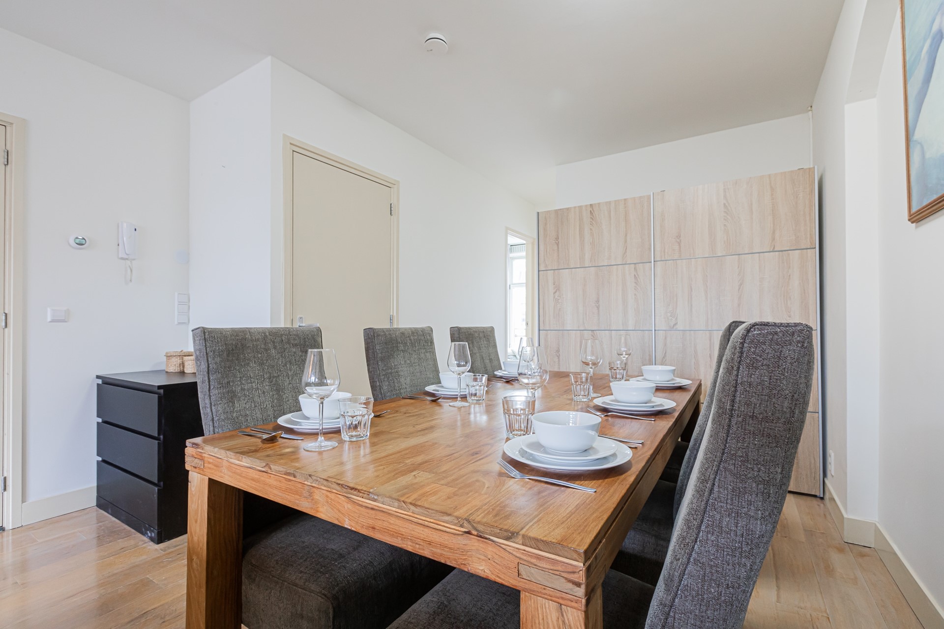 Entree is via het gemeenschappelijke trappenhuis op de derde etage. De lichte woonkamer heeft grote ramen die veel natuurlijk licht binnenbrengen. De open keuken is volledig uitgerust. Beide slaapkamers zijn ingericht met een tweepersoonsbed en kledingkast. De badkamer bestaat uit een douche, wastafel en toilet.