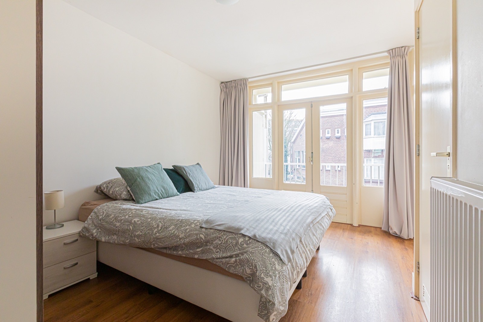 Entrance via the communal staircase on the second floor. The living room with fully equipped open kitchen is located at the front overlooking the Hugo de Grootplein. There are two bathrooms, the first with a shower and the second with a bathtub. At the rear is the quiet bedroom with double bed and wardrobe and access to the balcony.
