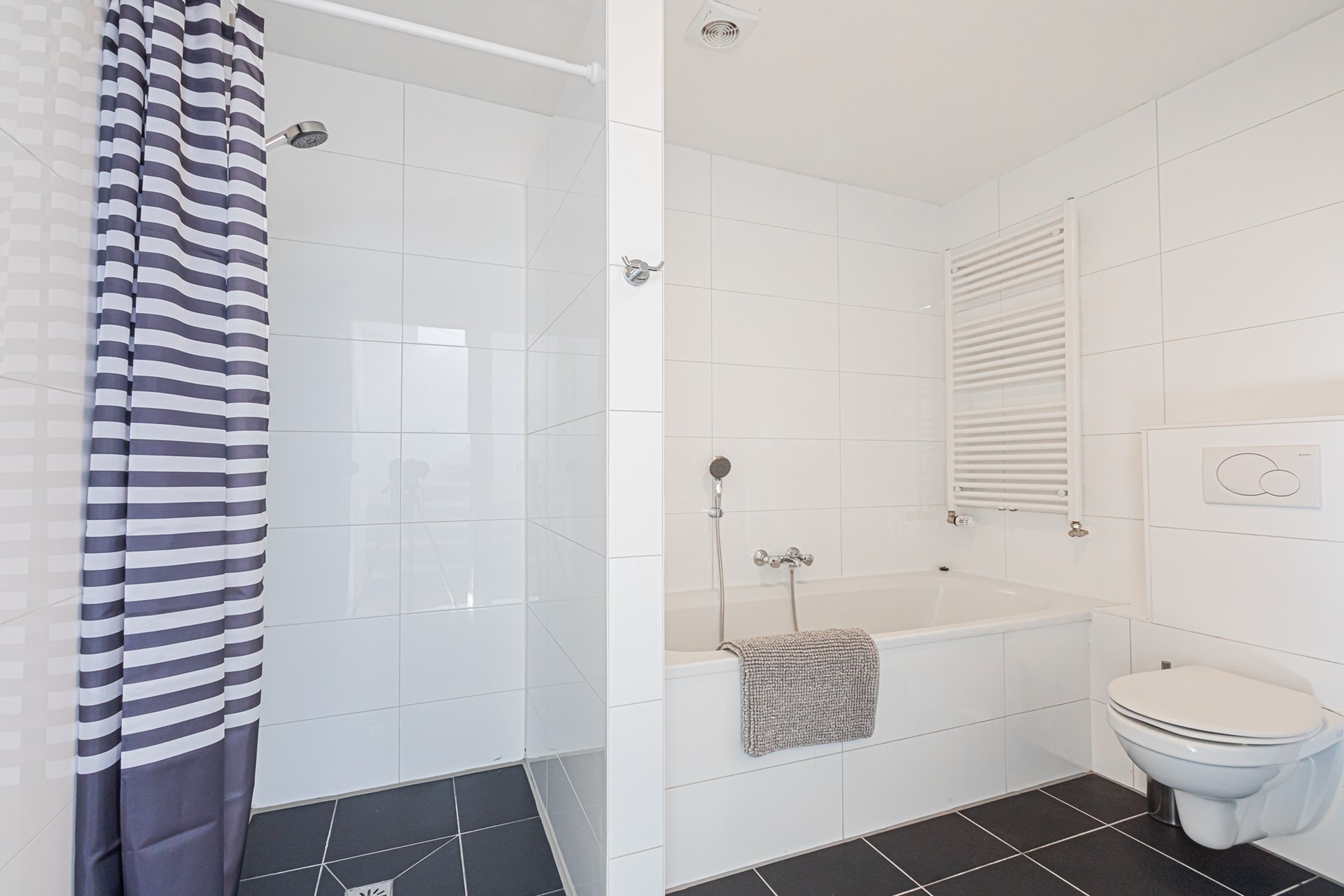 Aan de achterzijde ligt de woonkeuken met open keuken voorzien van afwasmachine, ijskast met vriezer, inductiekookplaat en combi oven/magnetron. Naast de woonkeuken ligt de eerste slaapkamer met een tweepersoonsbed en kledingkast. Aan de voorzijde ligt de tweede ruimere slaapkamer, met een tweepersoonsbed en kledingkast. De badkamer heeft een ligbad, inloopdouche, dubbele wastafel, douche en toilet. Via de interne trap is het heerlijke dakterras te bereiken.