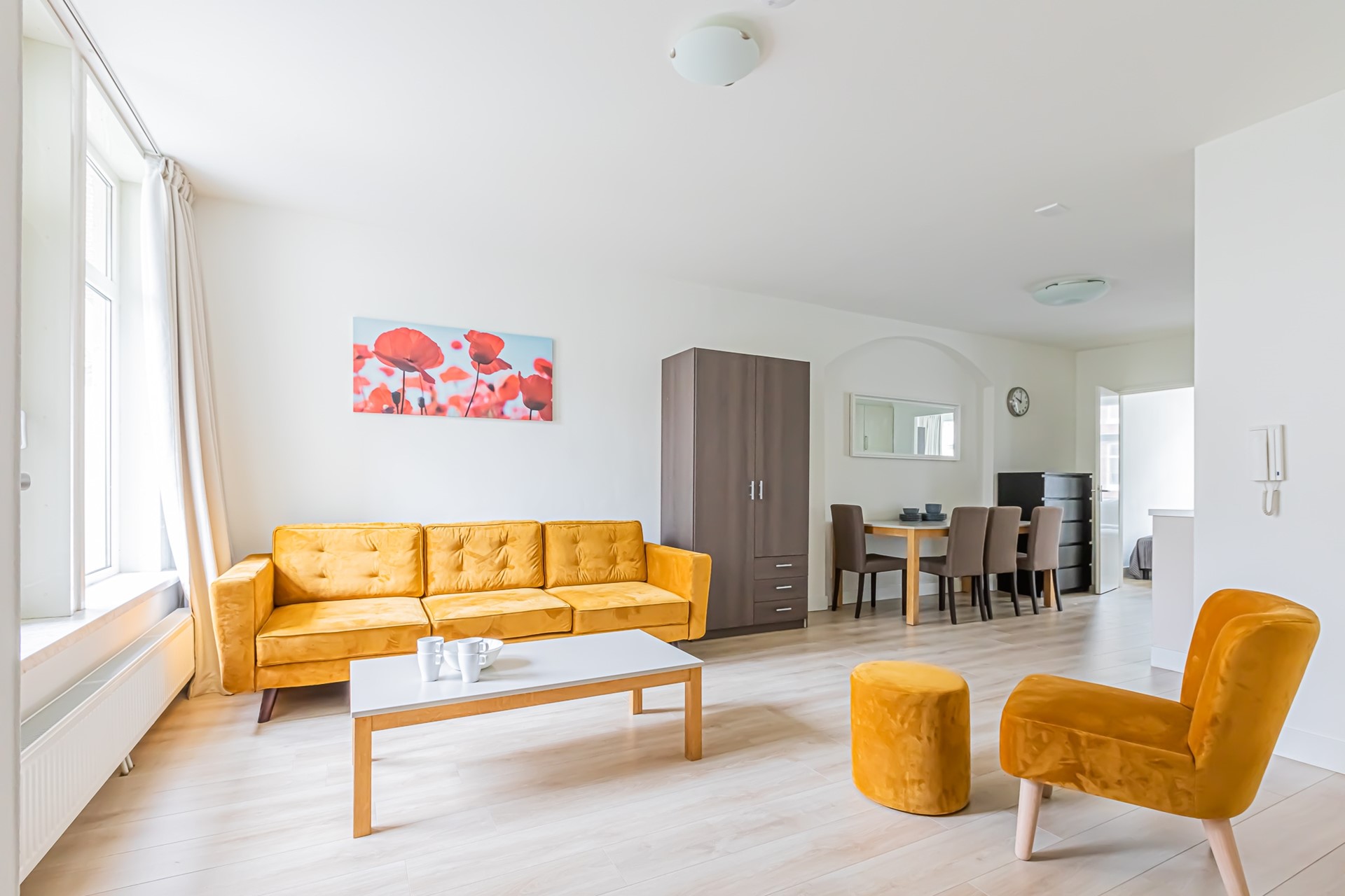 Entrance via the shared staircase to the first floor. At the rear of the apartment you will find the living room with an open-plan kitchen. The kitchen is fitted with an induction hob, dishwasher, refrigerator and combi oven/microwave. The bathroom is accessed from the living room and features a shower, bathtub, washbasin and toilet. At the front there are two bedrooms, each furnished with a double bed and wardrobe, one of which has a French balcony.