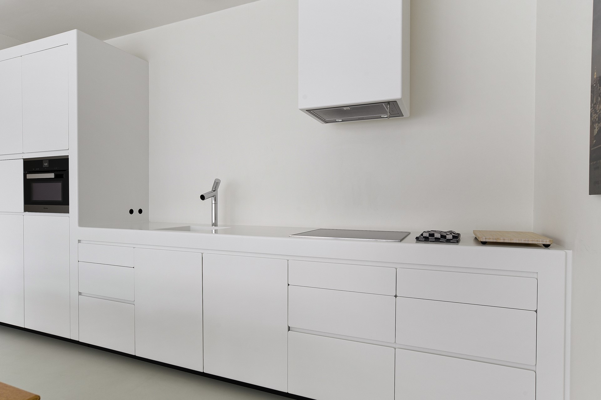 - ruime en lichte woonkamer met luxe open design keuken van Alessi/Valcucine met inbouwapparatuur van kwaliteitsmerk Miele