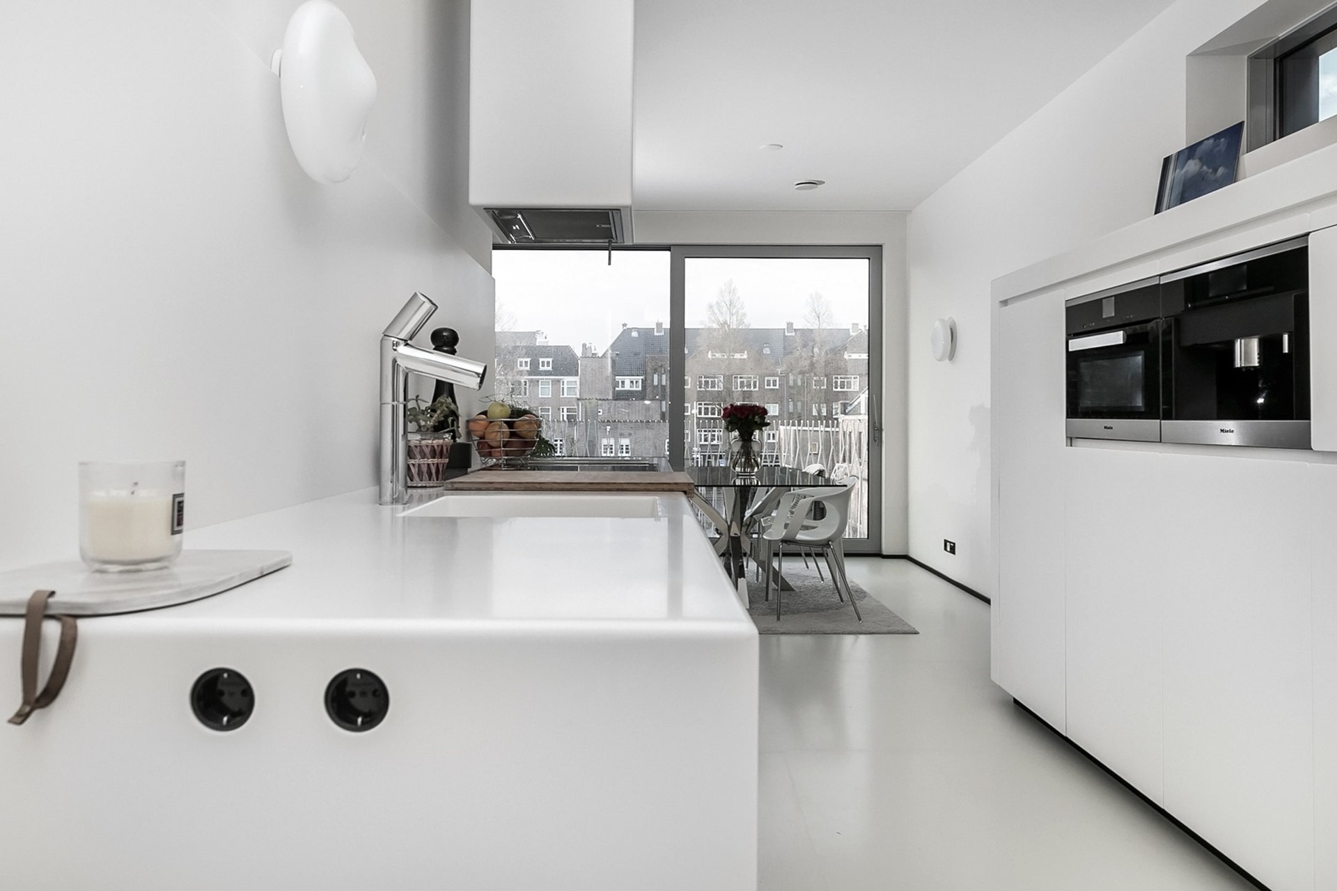 The living/dining room easily accommodates a spacious sitting area with dining table for 4 to 6 people. The large windows from ceiling to floor provide plenty of light, making it feel even more spacious. And above all, here you have a beautiful view of the Uilenburgergracht. The unprecedented luxury design kitchen by Alessi/Valcucine, called "LaCucinaAlessi", is equipped with appliances from quality brand Miele including dishwasher, fridge and freezer, combi-steam oven, coffee machine and induction hob with extractor. The bedrooms are both of good size and equipped with handmade built-in wardrobes. From both bedrooms you have access to the terrace situated on the southeast facing the communal courtyard garden.