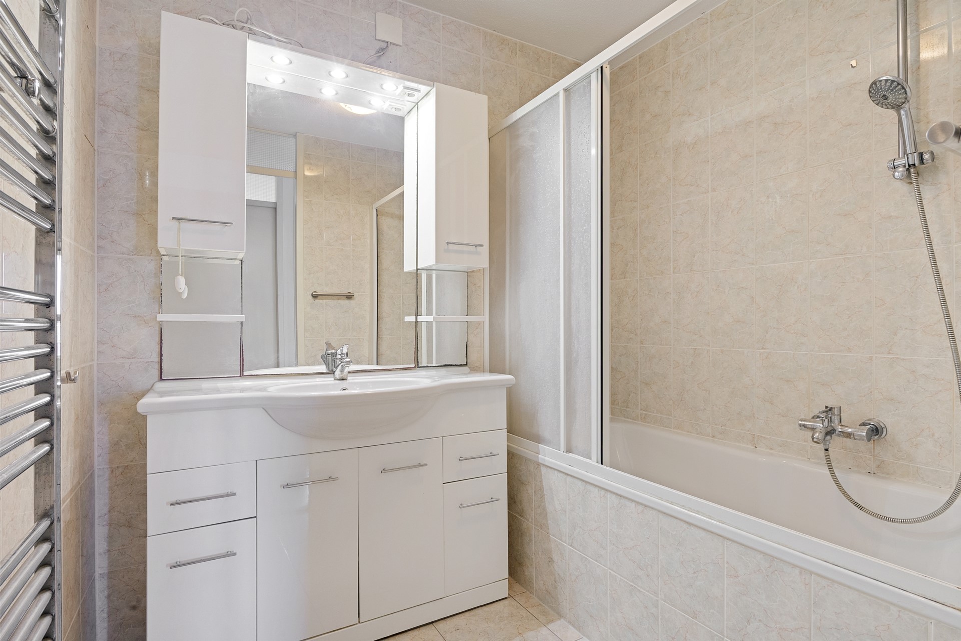 Bathroom with bathtub, walk-in shower, washbasin with vanity unit and designer radiator