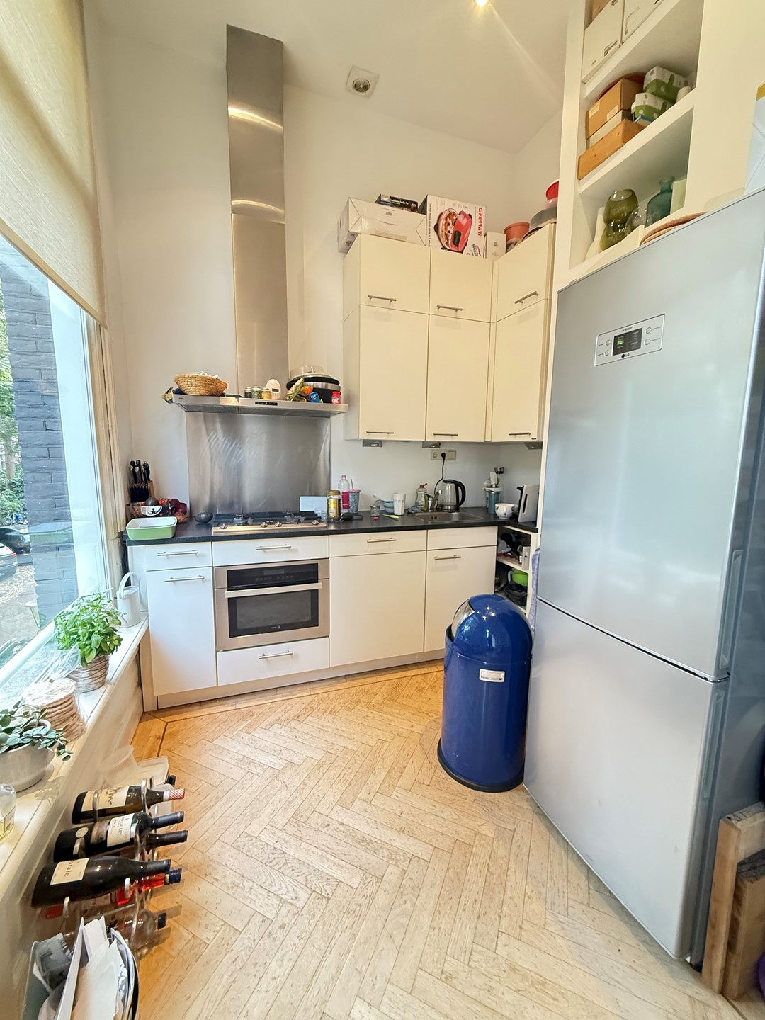 Entree via het gemeenschappelijke trappenhuis naar de eerste verdieping. Ruime woonkamer aan de voorzijde met een fraai uitzicht op de Vondelstraat en het Vondelpark. Aan de achterzijde bevindt zich de royale keuken/eetkamer, voorzien van een moderne Siematic keuken met hoogwaardige inbouwapparatuur (Bosch 6-pits gasfornuis, oven, Siemens koel-/vriescombinatie, magnetron en vaatwasser).