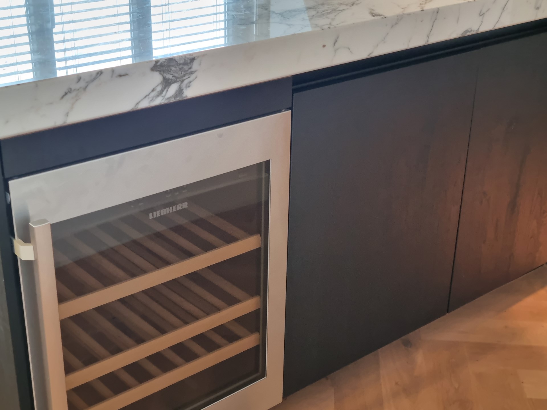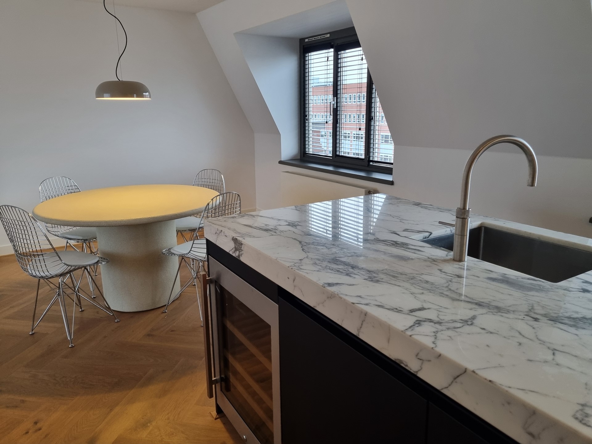 The apartment features a generous open-plan living, dining and kitchen area, all finished to an immaculate standard. The kitchen is truly outstanding, featuring thick grey and white marble countertops, a large feature island with integrated sink and wine fridge, and extensive built-in drawer storage. High-end appliances include an induction hob, double oven, dishwasher, and a convenient Quooker hot water tap. The kitchen and dining area enjoy views over the city and surrounding canals, making it an ideal space for entertaining.