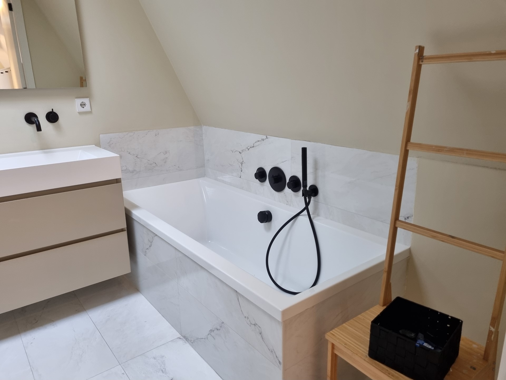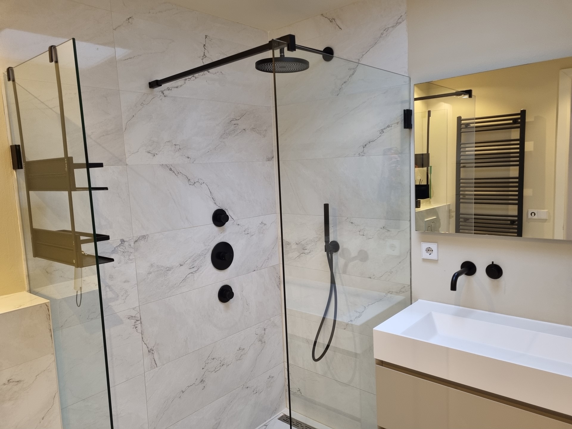 The apartment offers two good sized bedrooms, both finished with high-quality touches, bespoke drapes, and elegant soft furnishings. The luxurious bathroom continues the premium feel, featuring white marble finishes, dark hardware accents, a deep soaking bath, a large walk-in rain shower, a double-sink vanity with illuminated mirror, stylish built-in storage and toilet. There is also a separate toilet for added comfort and convenience.