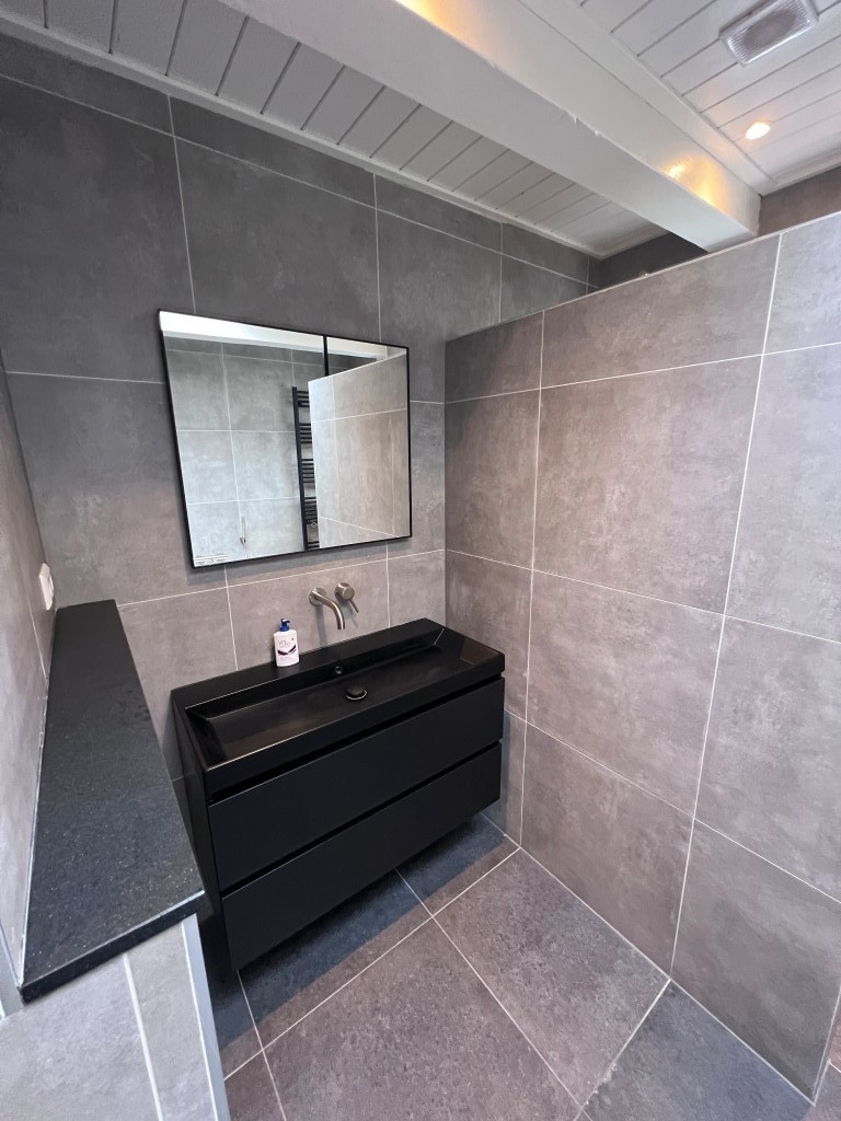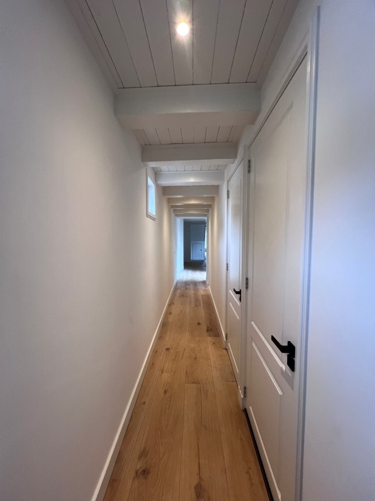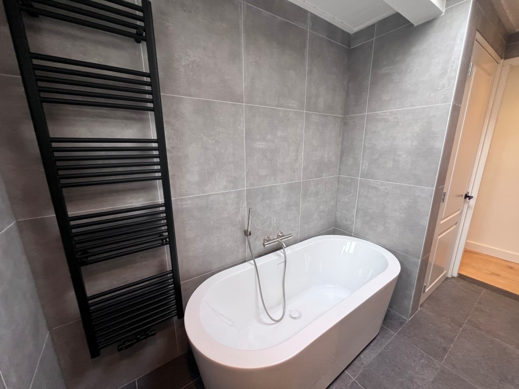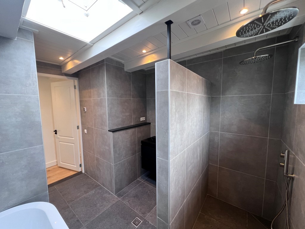 A wide hallway—ideal as a home office—also enjoys abundant daylight thanks to sliding doors to the roof terrace. From here you access the separate toilet and the luxurious bathroom, which is fitted with a bathtub, a walk-in double rain shower, a large washbasin with storage drawers, and a laundry cupboard for both washing machine and dryer.