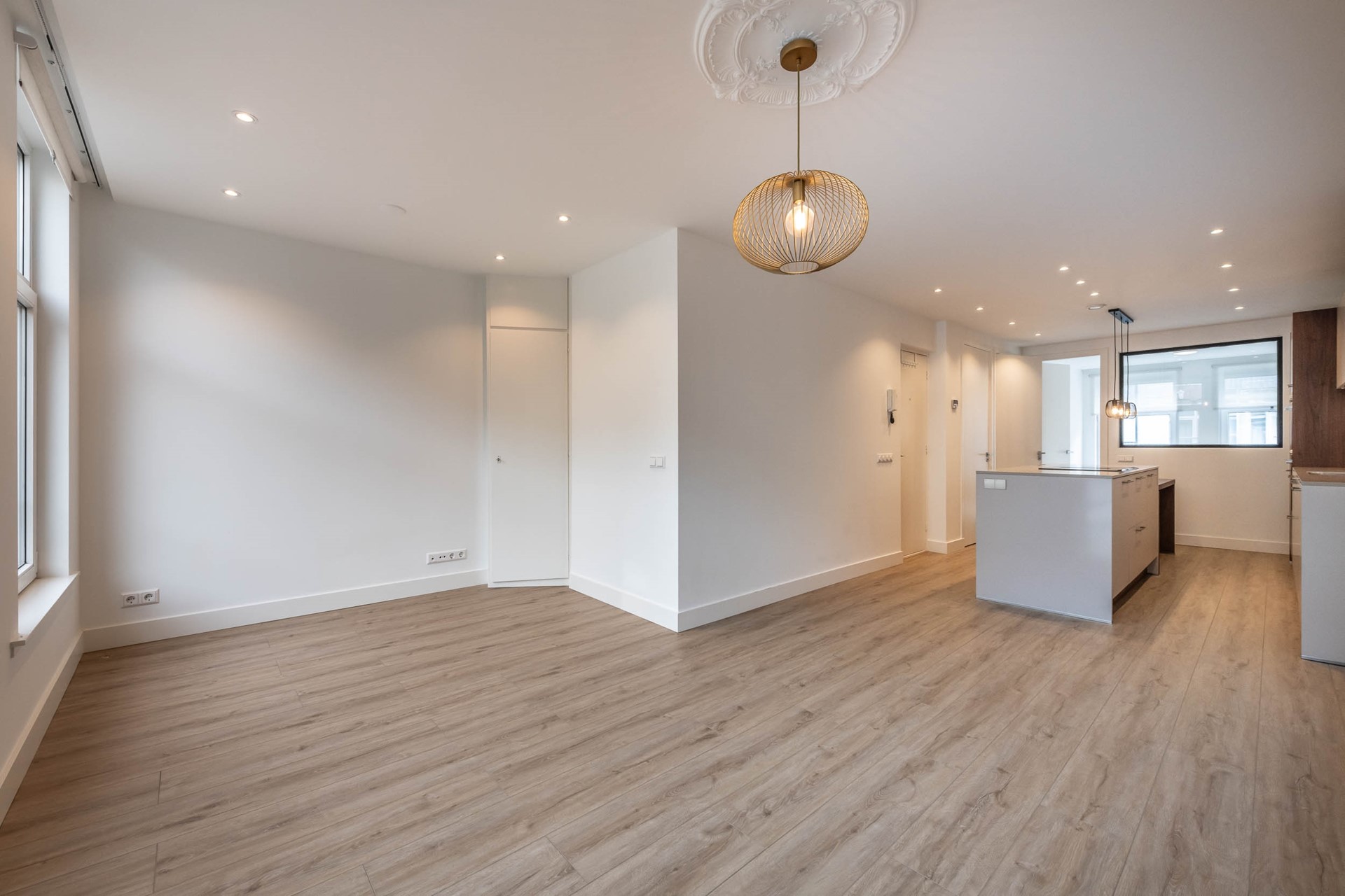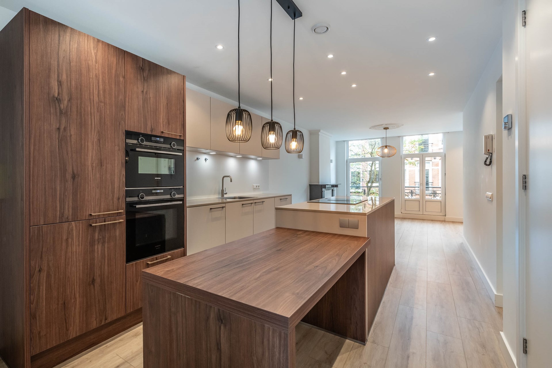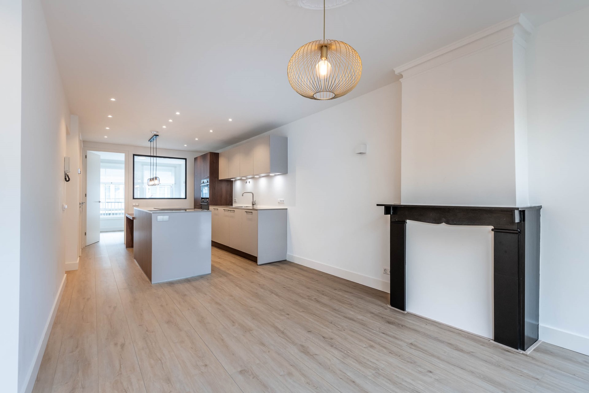The spacious and bright living room features a French balcony overlooking the picturesque Wilhelminastraat, and seamlessly connects to the open kitchen.