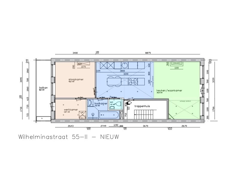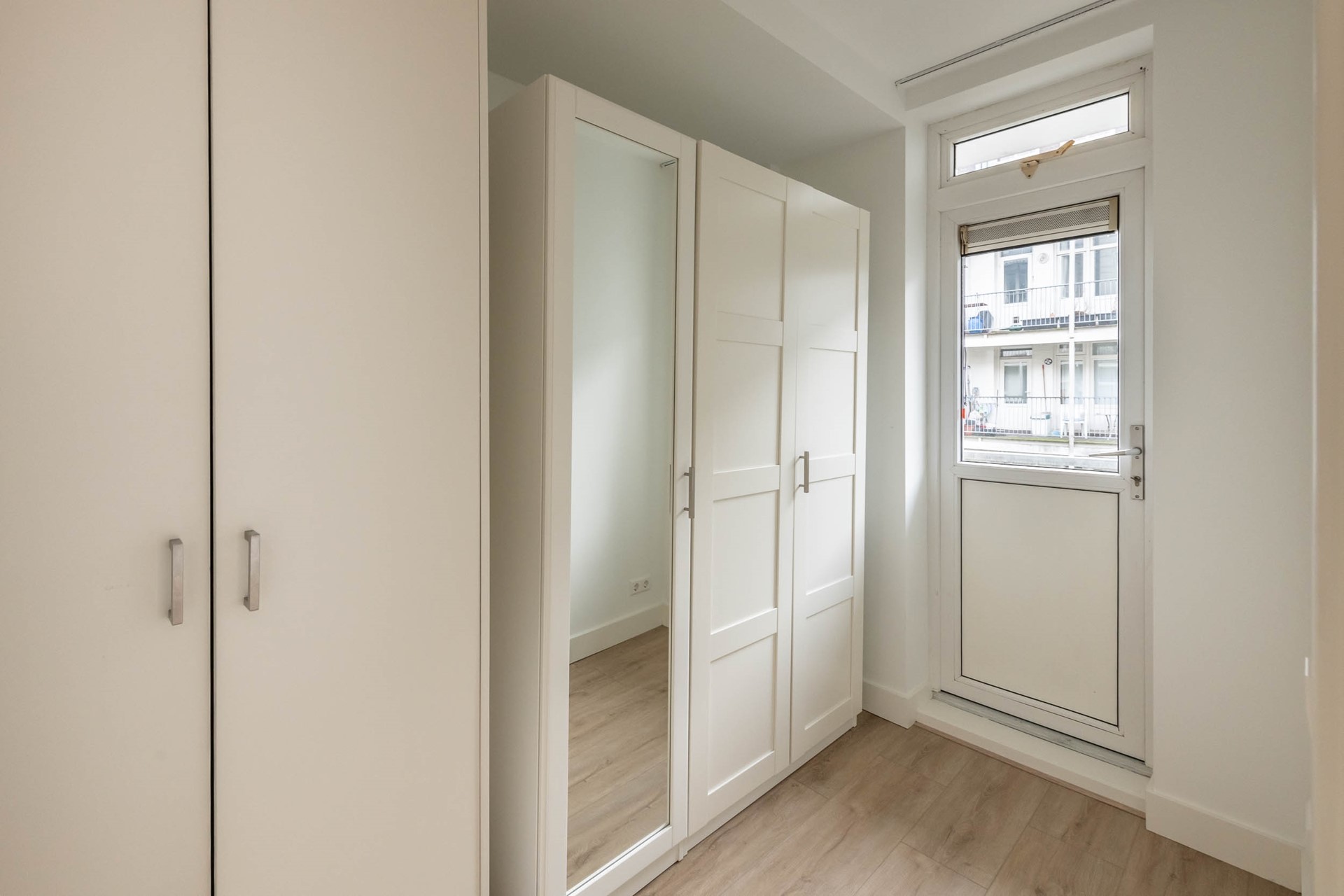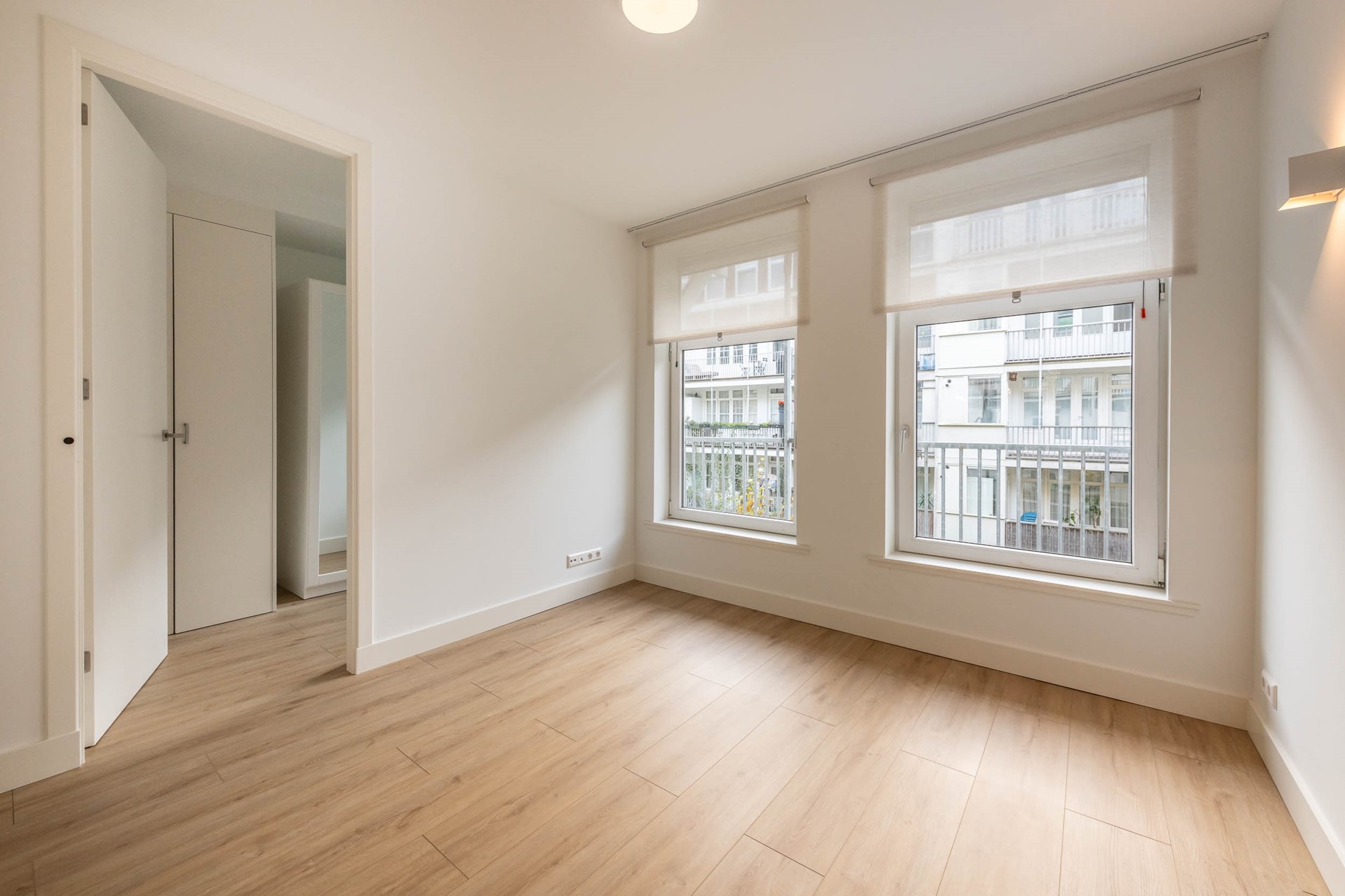 The spacious and bright living room features a French balcony overlooking the picturesque Wilhelminastraat, and seamlessly connects to the open kitchen.