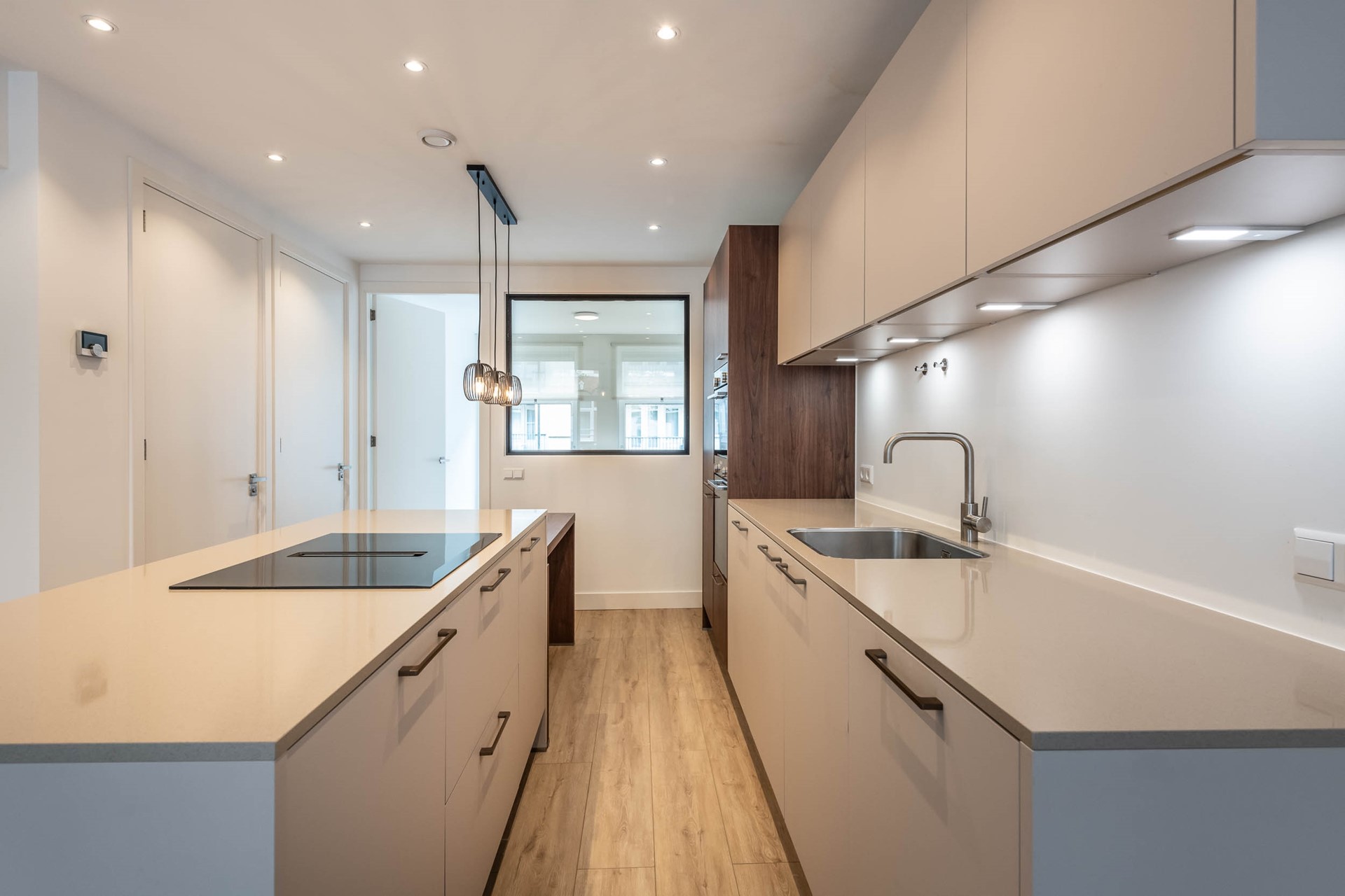 The modern kitchen is fully equipped with an induction cooktop, fridge with freezer, dishwasher, oven, and microwave, making it both functional and stylish.