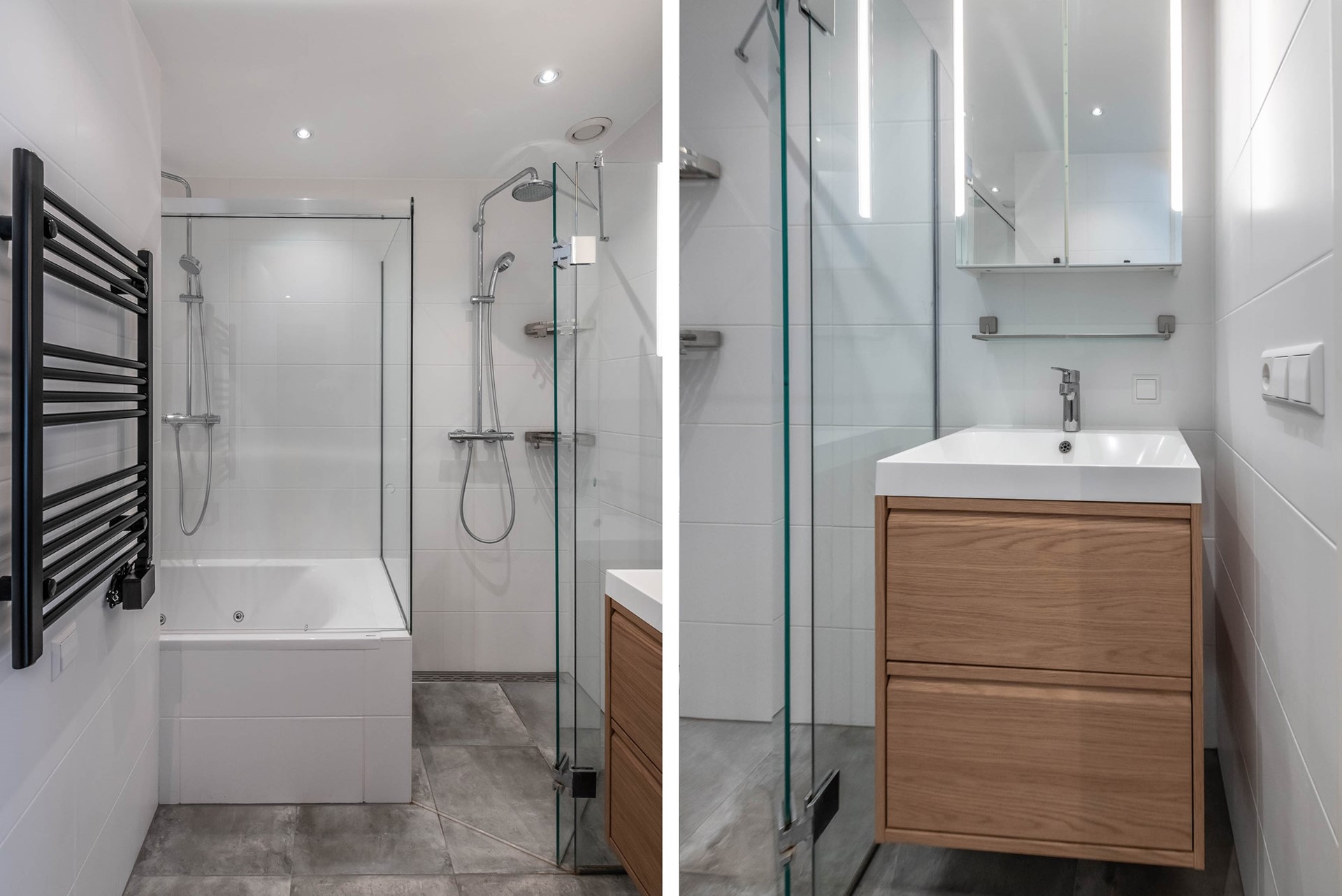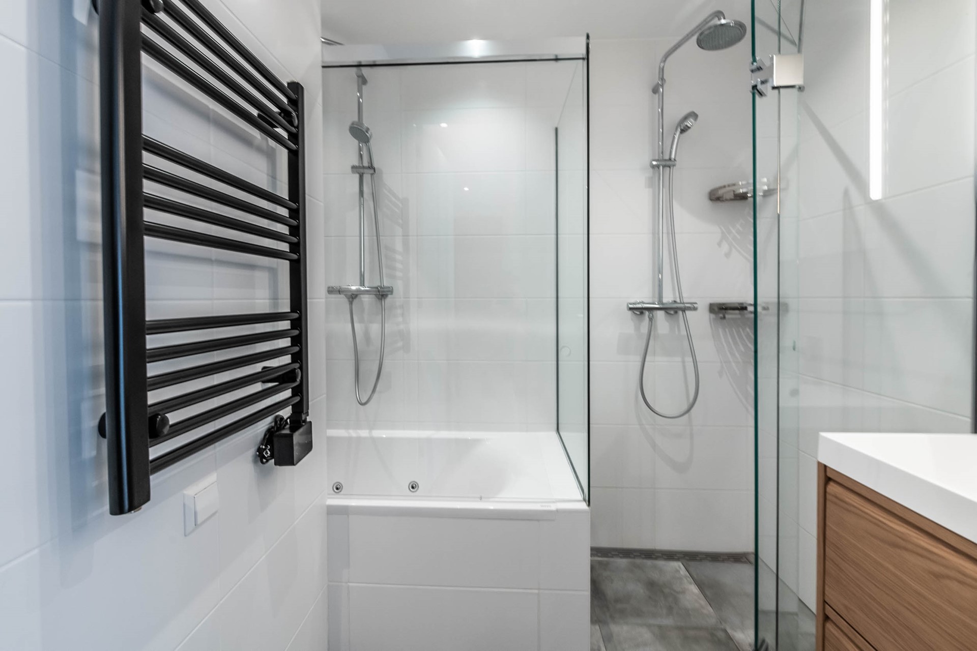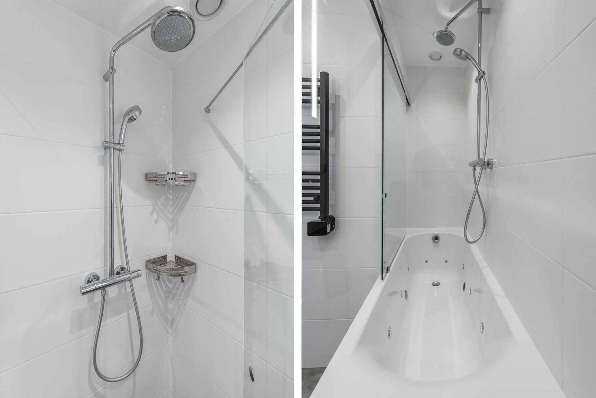 The bathroom is finished to a high standard and features a bathtub, separate shower, and towel heater. There is also a separate toilet.