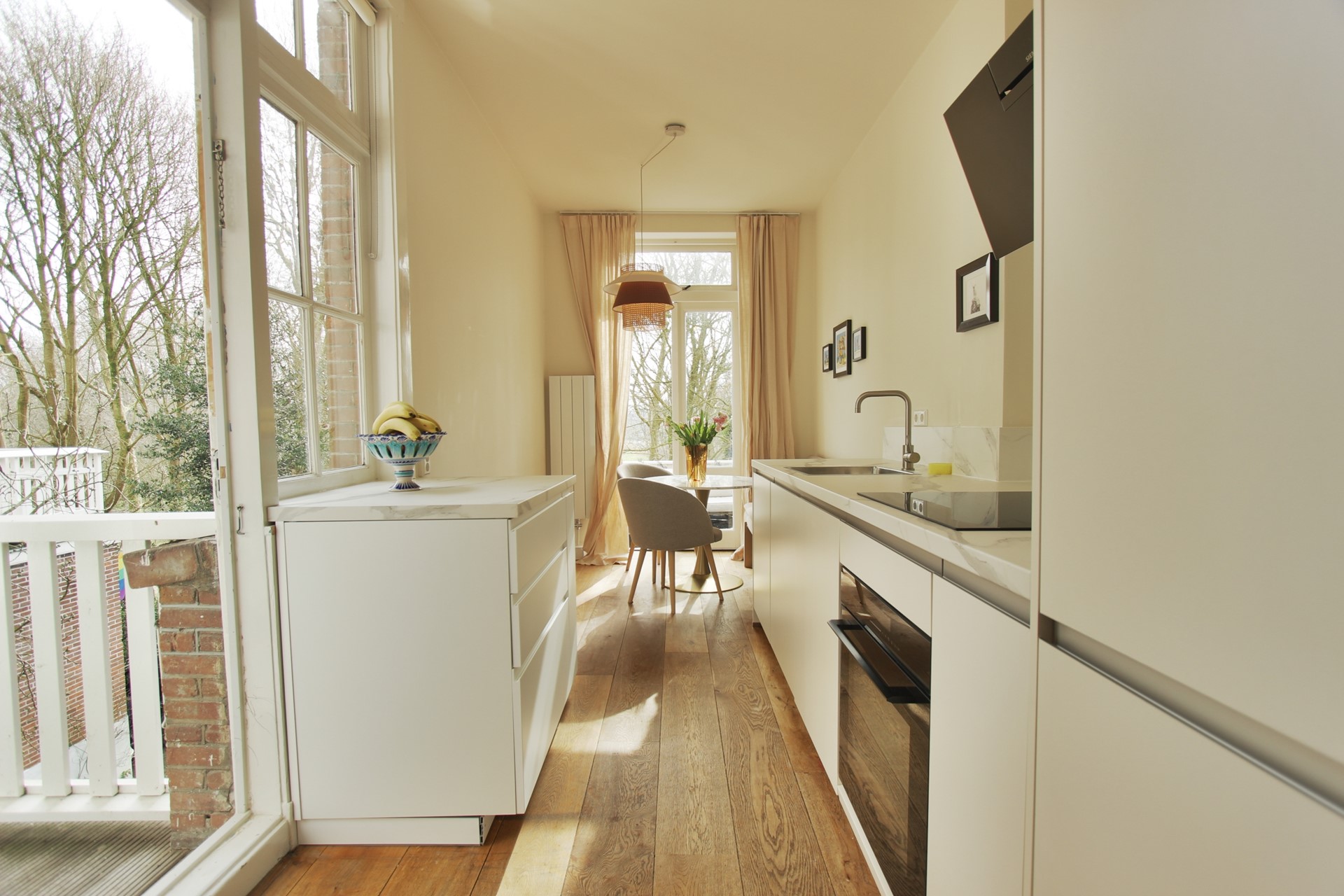 De moderne open keuken is van alle gemakken voorzien en sluit naadloos aan op het eetgedeelte, waardoor een gezellige en functionele leefruimte ontstaat. Vanuit hier heb je directe toegang tot zowel het terras als het balkon, die beide uniek gelegen zijn aan het Vondelpark. Dit maakt het mogelijk om op elk moment van de dag te genieten van de rust, het groen en het uitzicht.