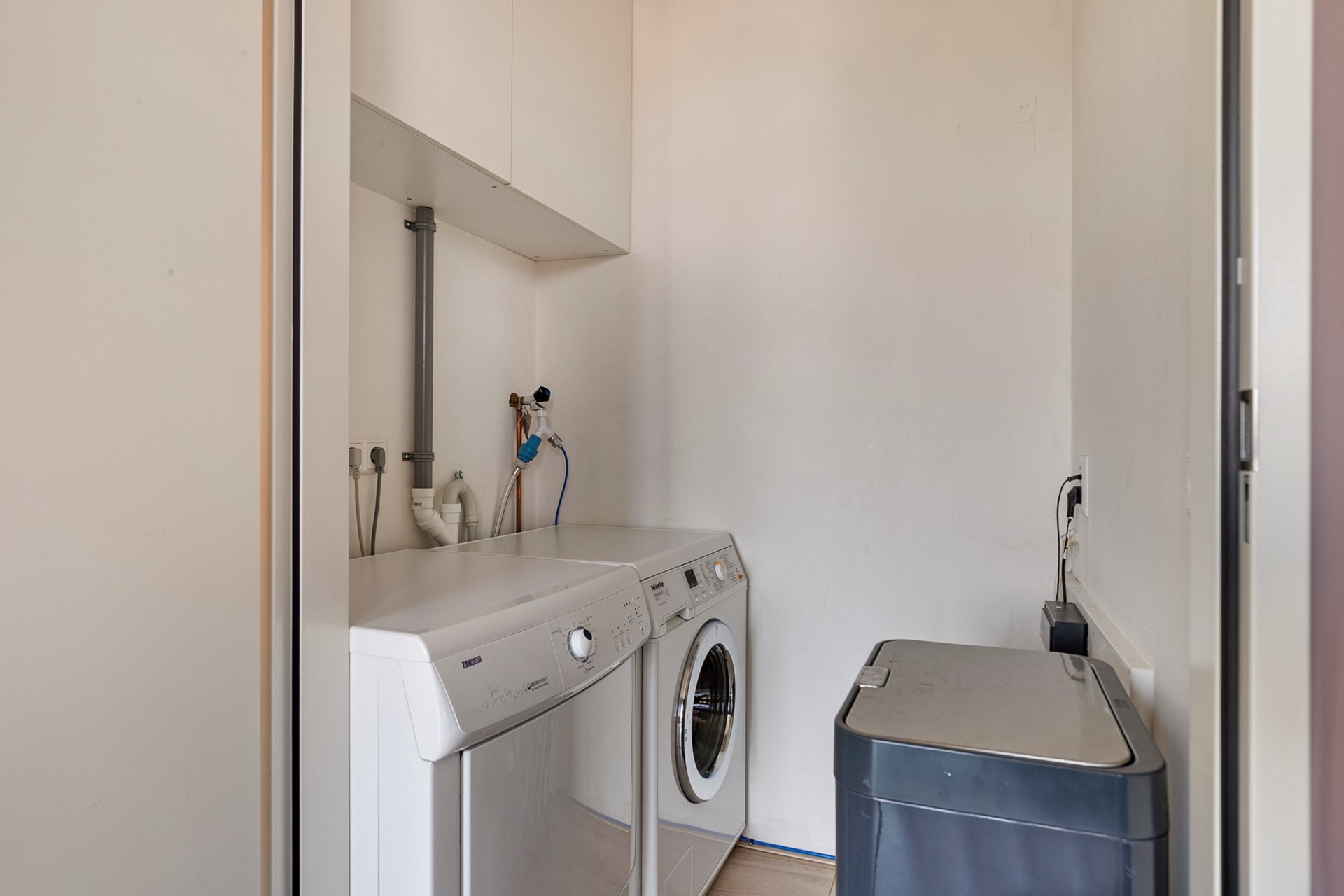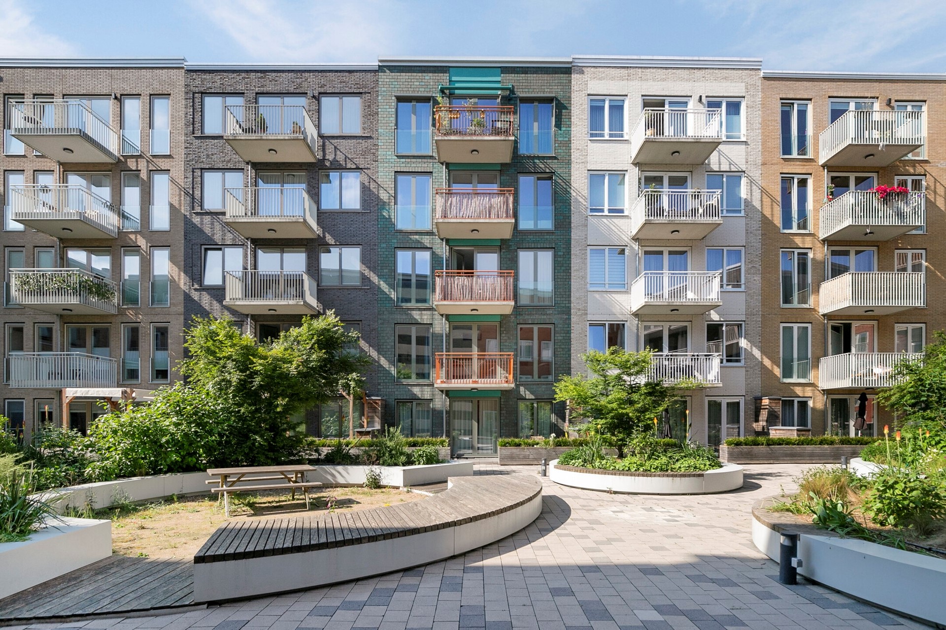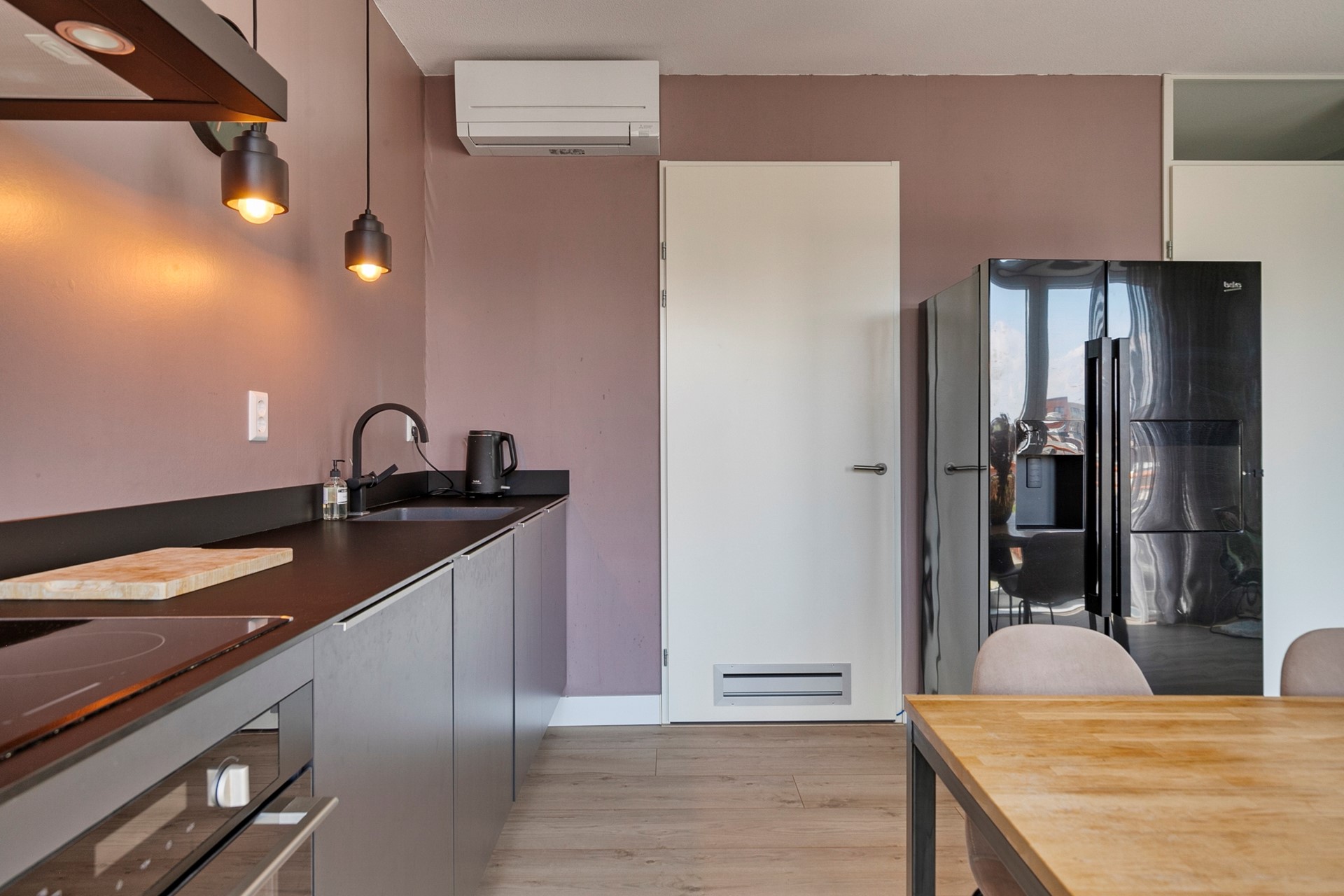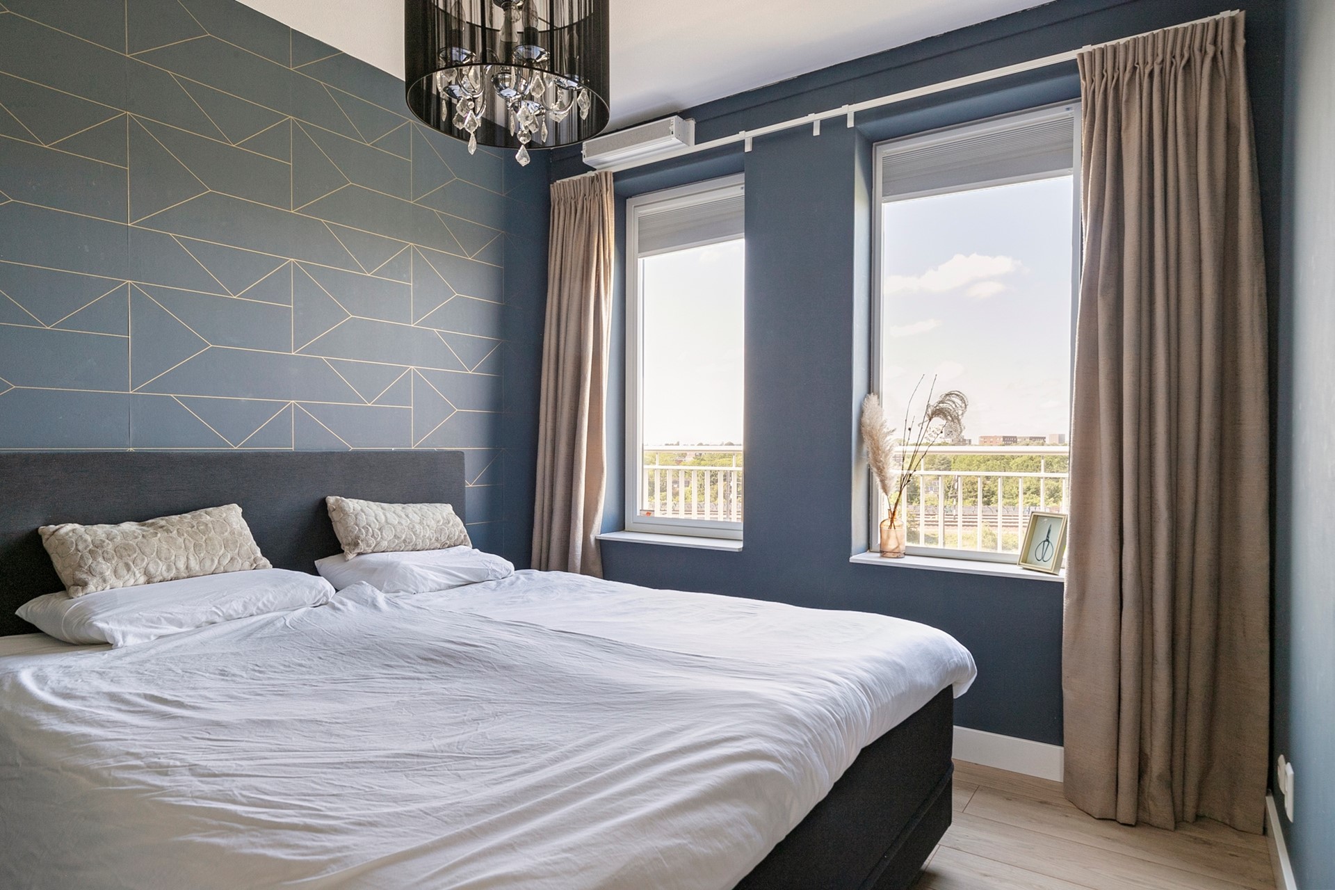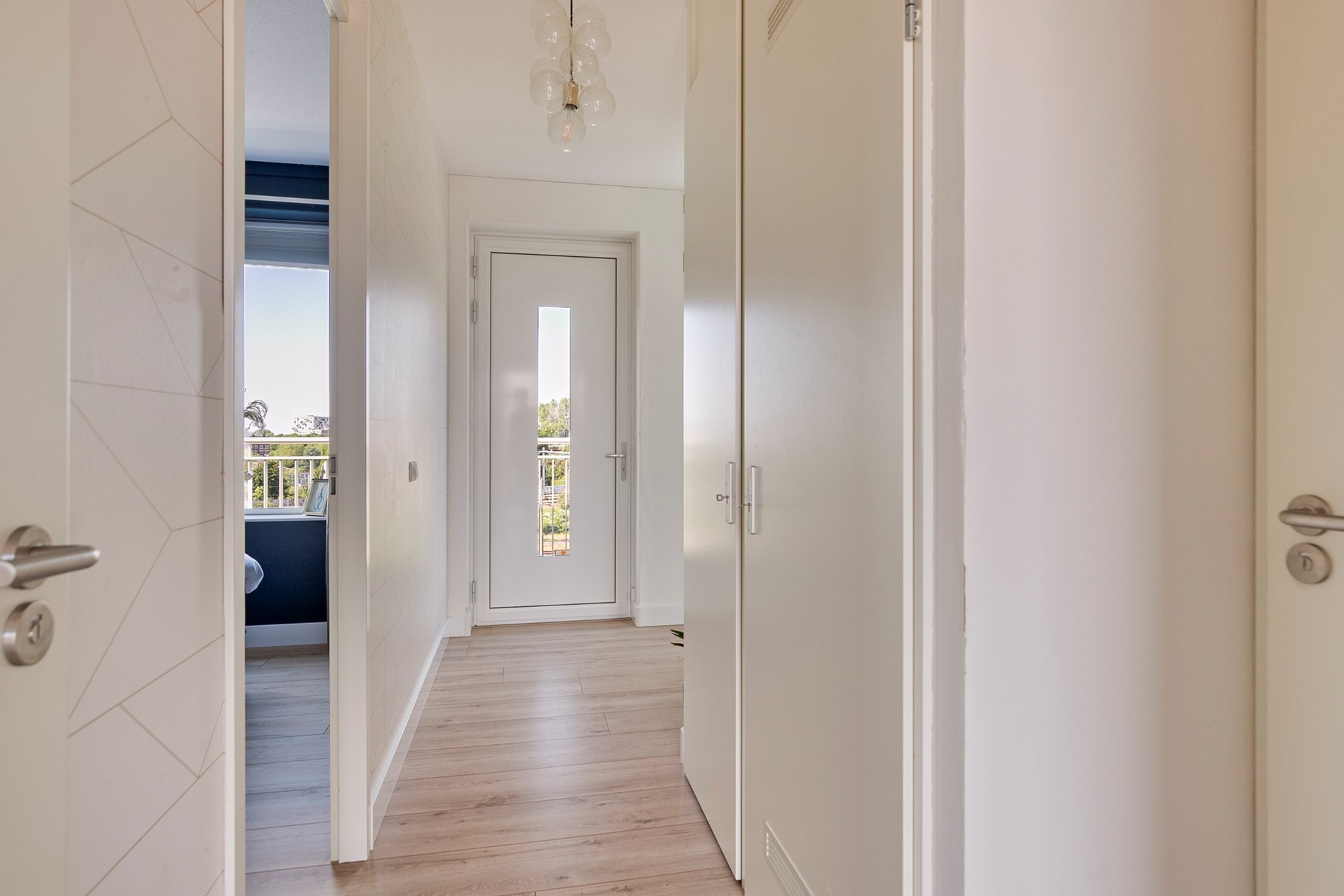 Centrale entree met lift en trappenhuis welke toegang geeft tot de bovenliggende etages. Via de galerij op de 5e verdieping bereikt u de woning. Entree met hal en toegang tot de verblijfsruimtes. De woonkamer is aan achterzijde gelegen en over de gehele breedte gesitueerd en genereerd daardoor veel daglicht. De luxe open keuken is v.v. alle wenselijke inbouw apparatuur als een vaatwasser, inductie kookplaat, oven en Amerikaanse koelkast met vriezer. Vanuit de woonkamer toegang tot het terras. Via de keuken toegang tot de berging met was/ droog combinatie. De slaapkamers zijn beide aan de voorzijde gelegen. De 2e slaapkamer heeft een ruime inbouwkast en komt met werkplek. De ruime badkamer heeft een inloop douche, bad en luxe wasbak. Het toilet is separaat op de hal.