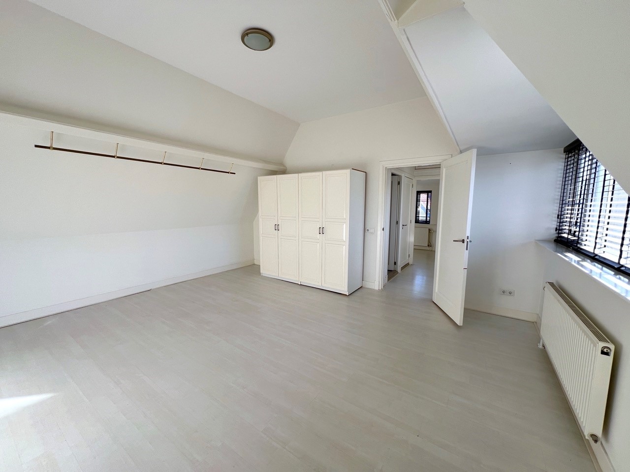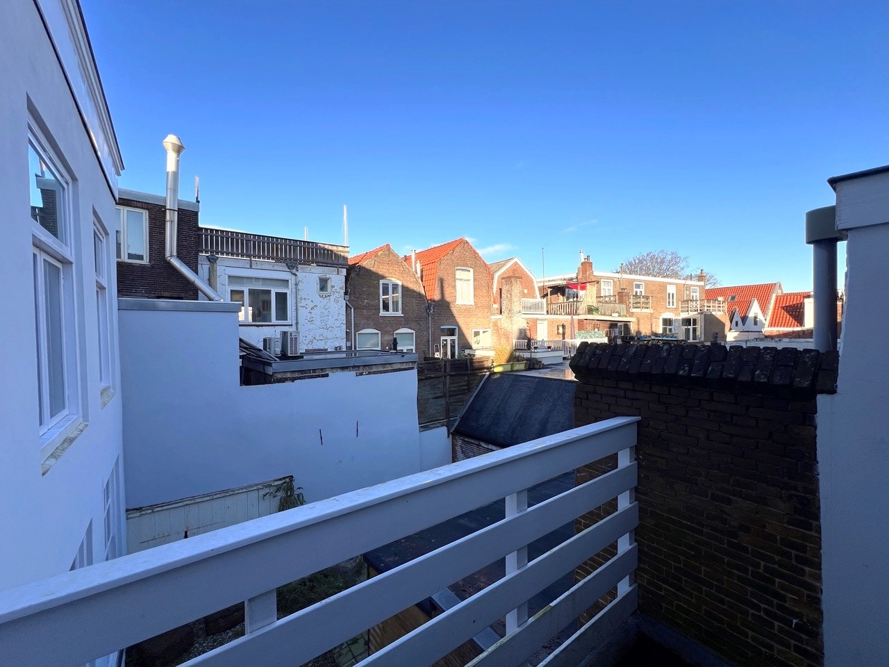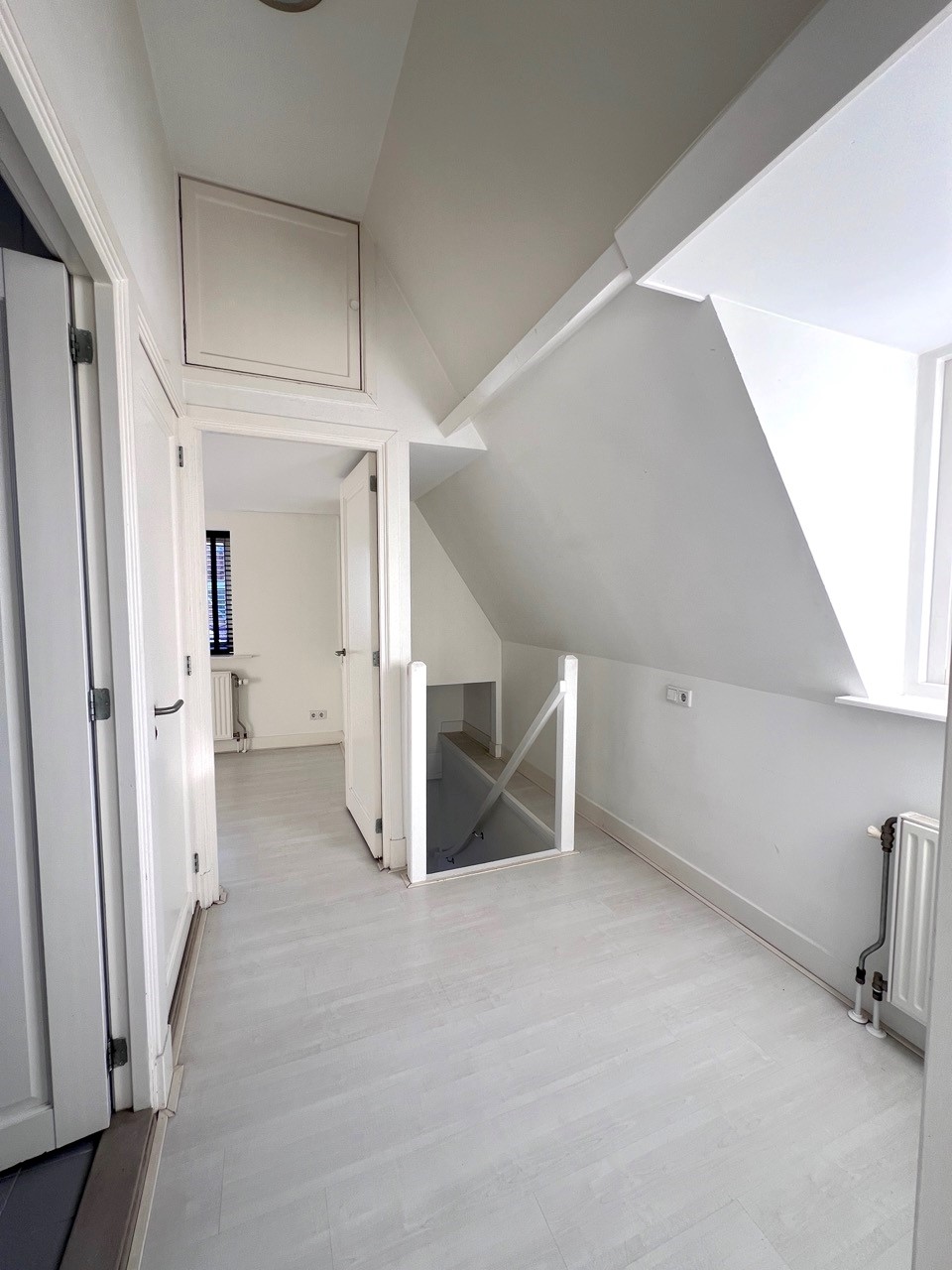 We offer a spacious and bright 3 room duplex apartment of approx. 110 m2 located on the first floor of a renovated national monument in the main shopping street of Haarlem ‘de Grote Houtstraat’. The property at the back is characterized by the high ceilings, bright atmosphere, a semi open kitchen, the haring bone pvc floor, well sized bathroom and balcony facing West. The apartment has a view of the gardens behind the main street and has a loft feel about it. Because all rooms are located at the rear of the building you can enjoy both a lively neighborhood of the city of Haarlem but have the tranquility at home.