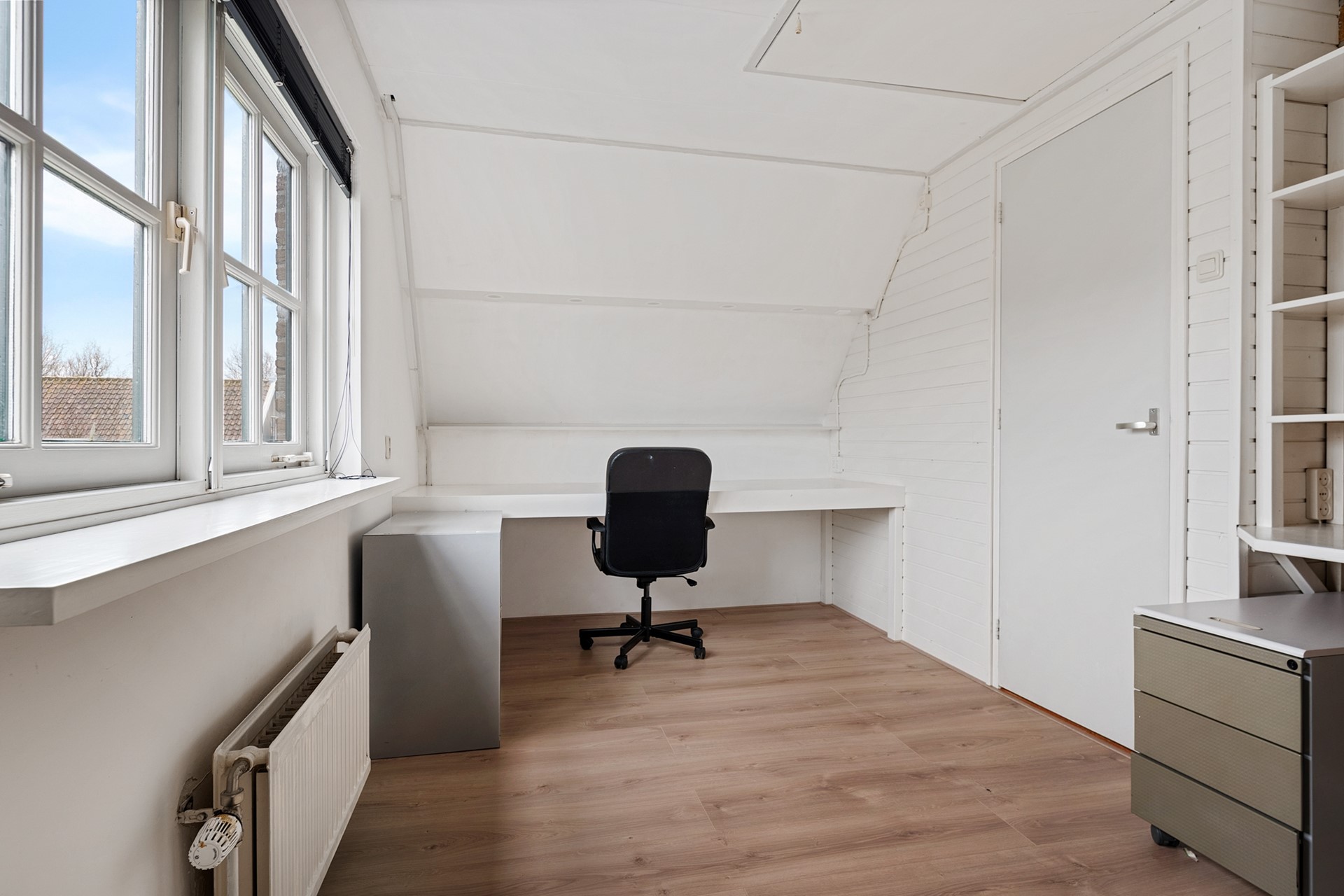 Aan de achterzijde bevindt zich de tweede slaapkamer, momenteel ingericht als studeerkamer, maar in overleg eenvoudig in te richten als volwaardige slaapkamer.