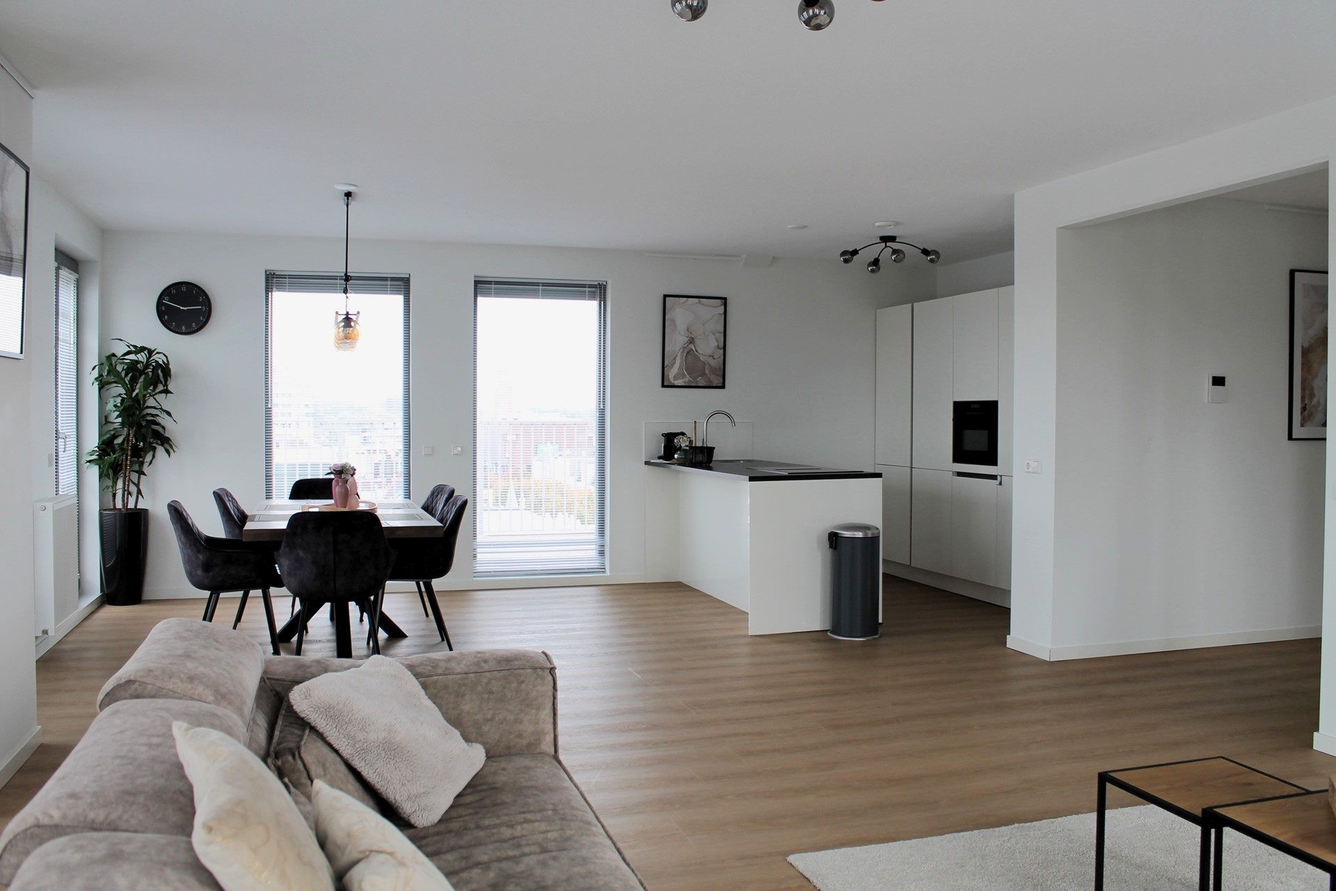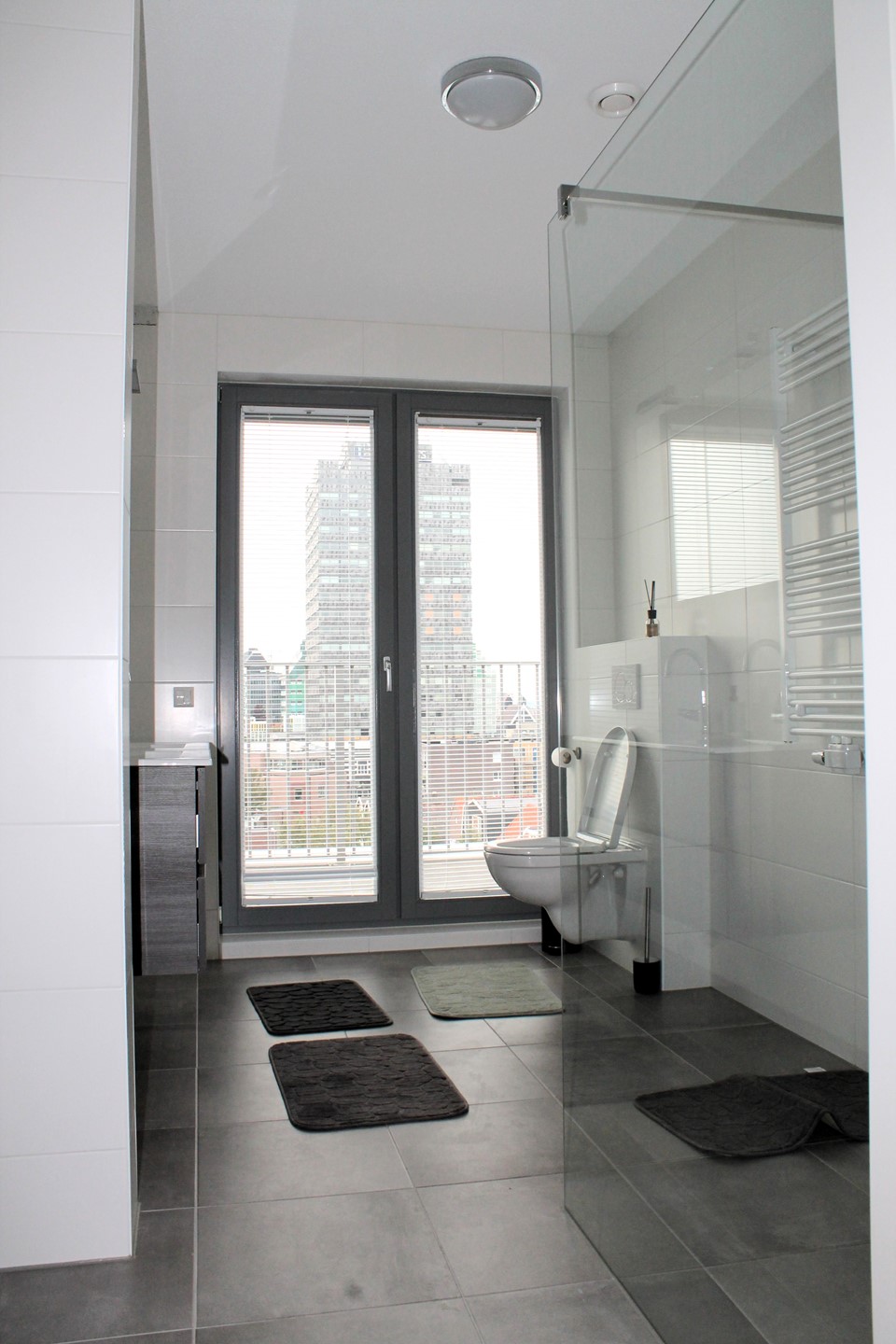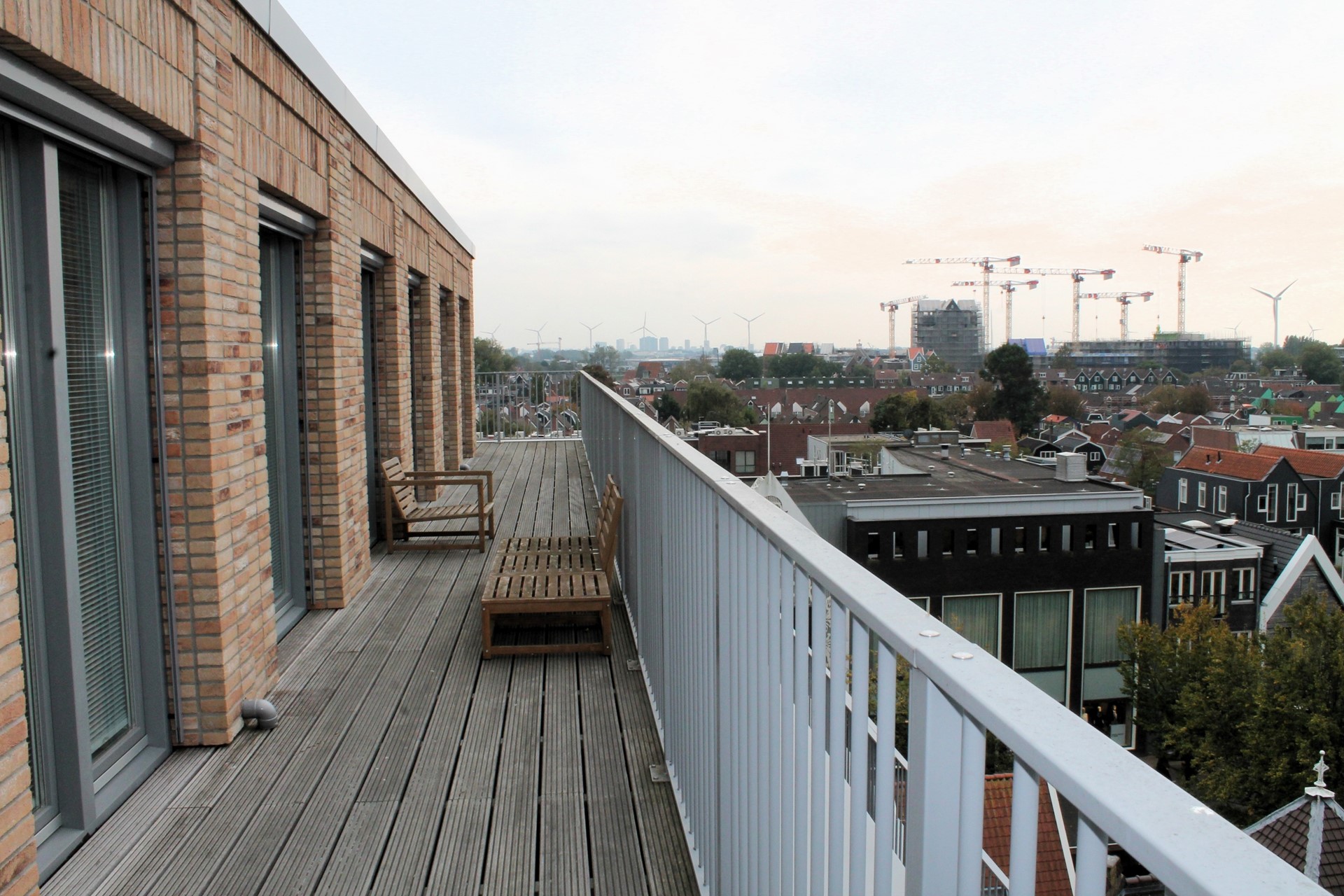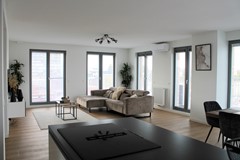 Through the entrance of the spacious penthouse located on 5th floor, you have access to all rooms and a fantastic view over the center of Zaandam. The spacious penthouse is furnished and has a beautiful living room and luxurious kitchen. The modern kitchen with cooking island is fully equipped: induction hob with integrated extraction, combination microwave/oven, fridge, freezer and dishwasher. There are three spacious bedrooms all with airconditioning, a separate toilet and a luxurious bathroom with a lovely rain shower, modern sink and a floating toilet. There is a spacious communal bicycle storage on the ground floor.