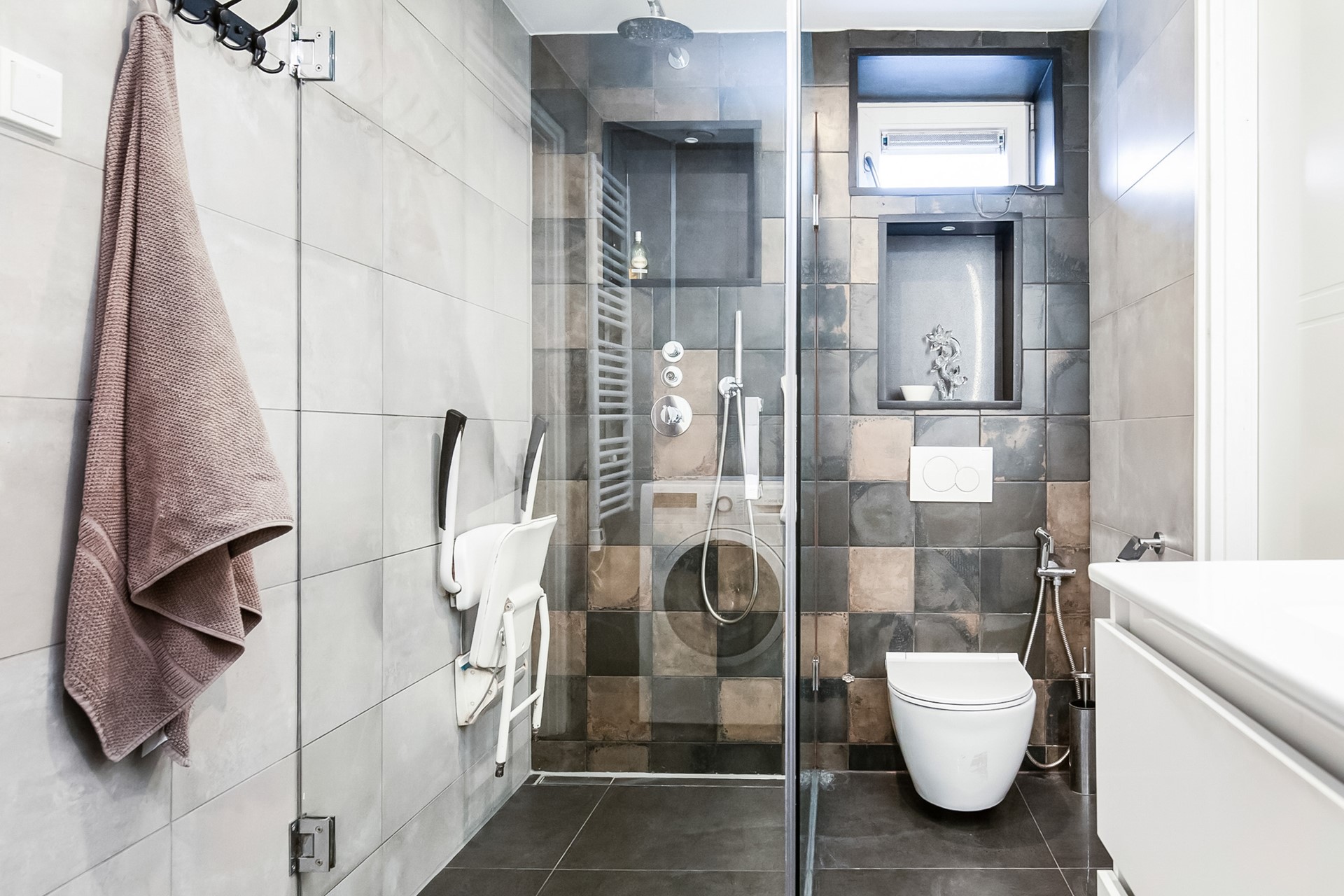 This floor also includes a bathroom with shower, washbasin and toilet. Additional storage space is available in built-in cupboards.