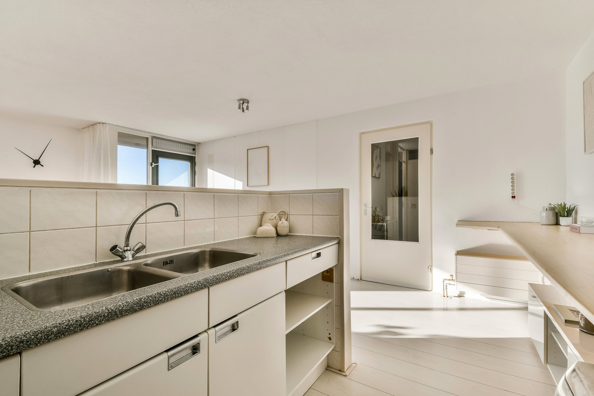 De woonkamer is gelegen op het zuiden en biedt toegang tot het eveneens op het zuiden gesitueerde balkon. Aangrenzend bevindt zich de halfopen keuken. Daarnaast is er een praktische bijkeuken met voldoende bergruimte; hier is tevens de cv-installatie geplaatst.