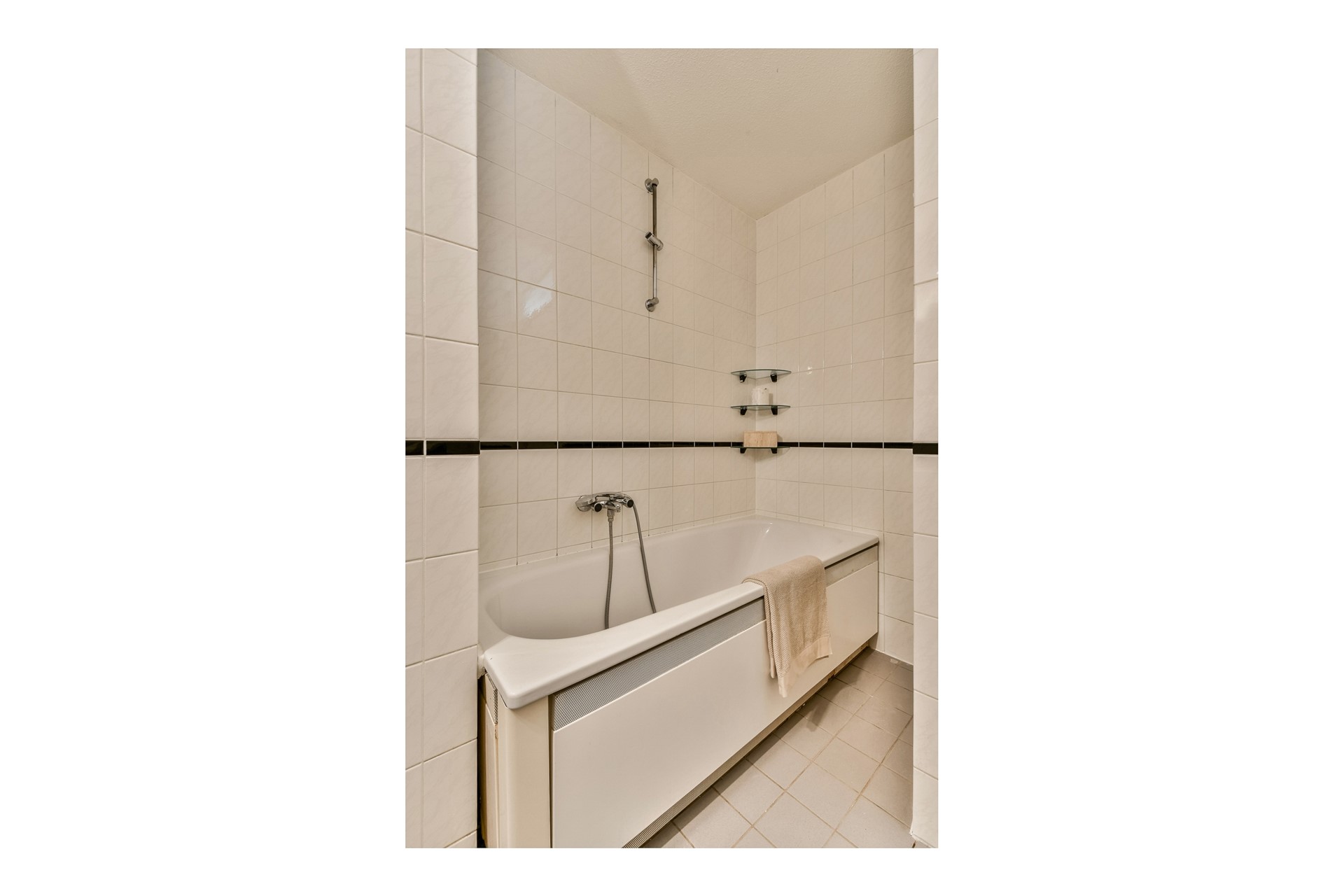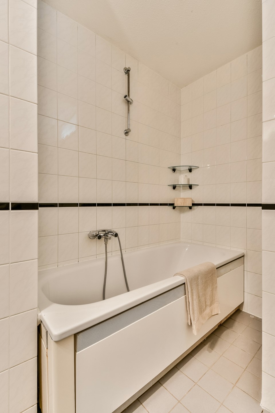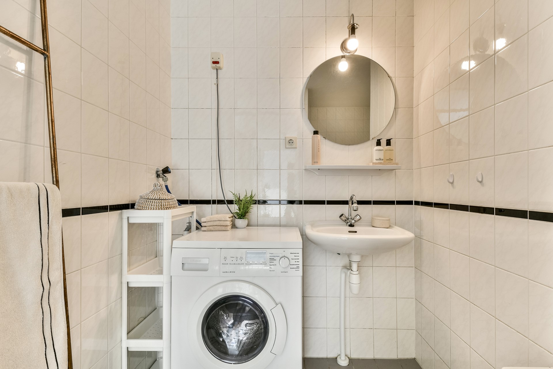 De badkamer is uitgerust met een ligbad met douche en een wastafel. Ook is hier de aansluiting voor de wasmachine.