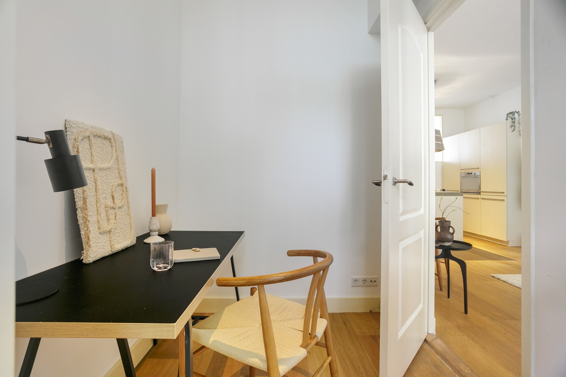 Upon entering the living area, the high ceiling of approx. 2.9 meters immediately catches the eye, creating a wonderful sense of space and light. The open kitchen is fully equipped with a dishwasher, 4-burner gas hob, combi oven/microwave, fridge/freezer combination, and ample storage. From the sitting area, you have access to the second room – ideal as a home office or nursery.