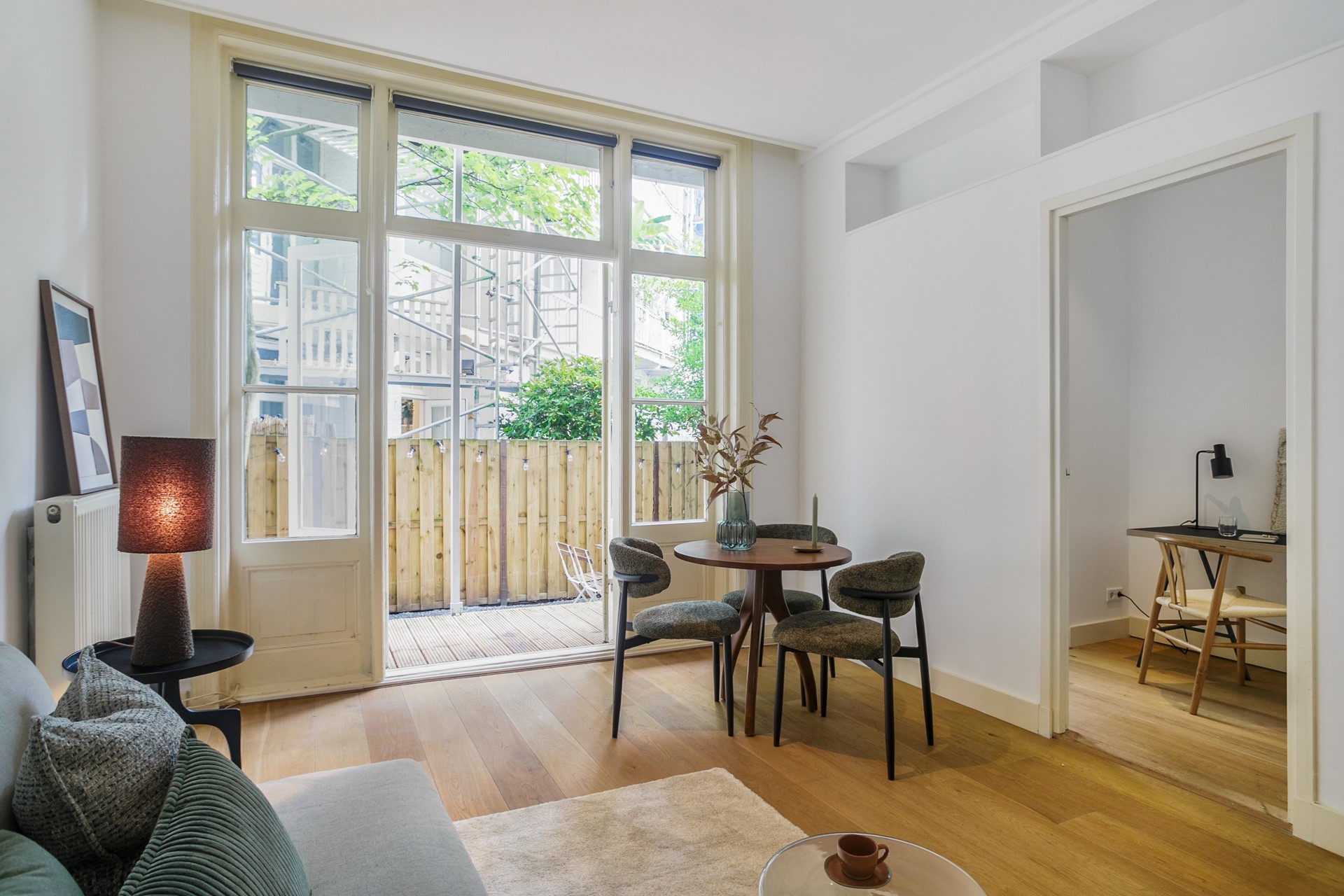 This delightful apartment has an efficient and well-thought-out layout. At the front you’ll find a spacious and quiet bedroom, while at the rear the living room seamlessly connects to the open kitchen. Thanks to the French doors, you can step straight from the veranda into your private garden – a lovely spot to relax or enjoy a drink with friends. The second room, perfect as a study or guest room, is also located at the garden side.