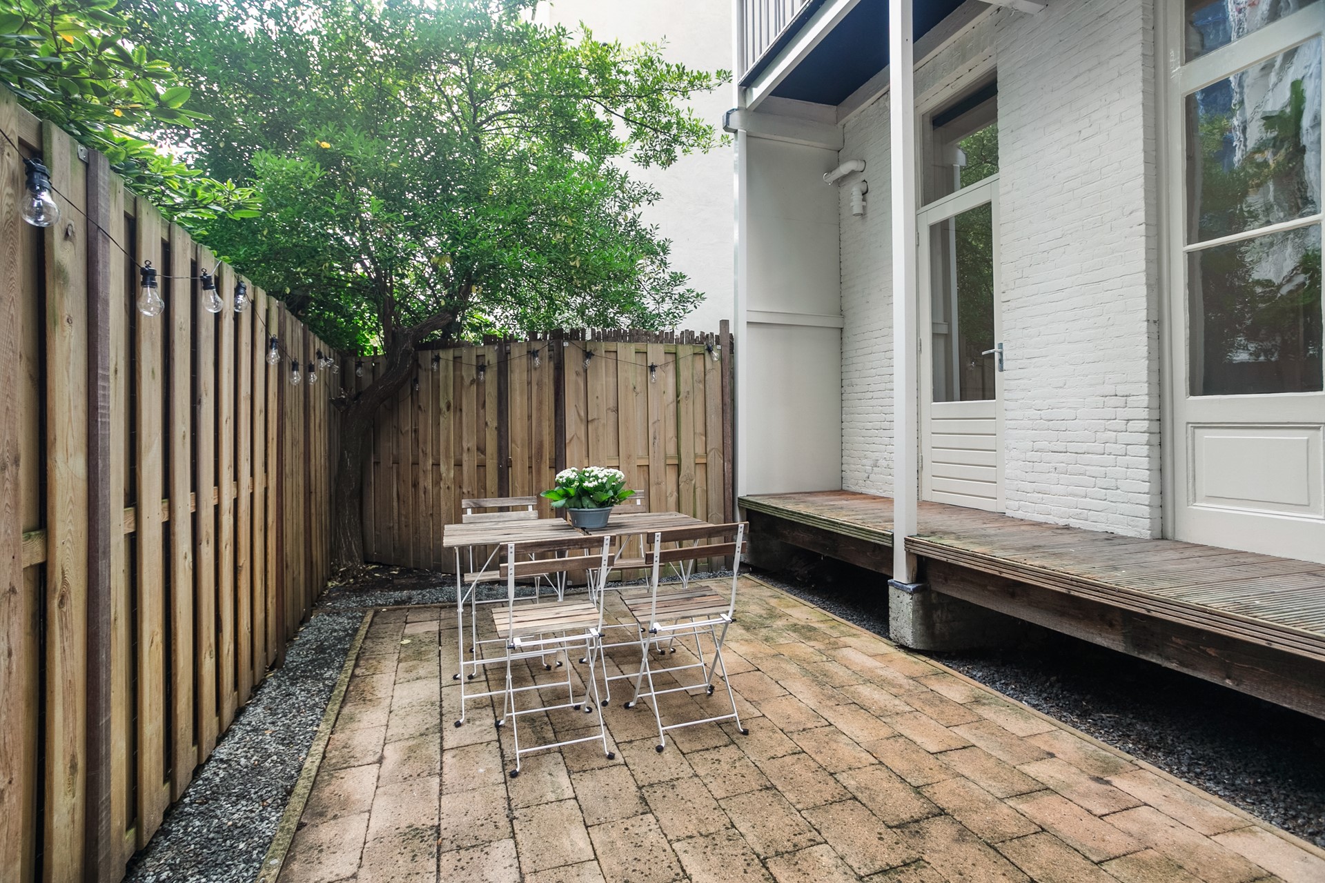 Via de openslaande deuren stap je vanuit de woonkamer op de veranda en vervolgens in de beschutte achtertuin (gelegen op het noorden) – een fijne buitenruimte midden in de stad.