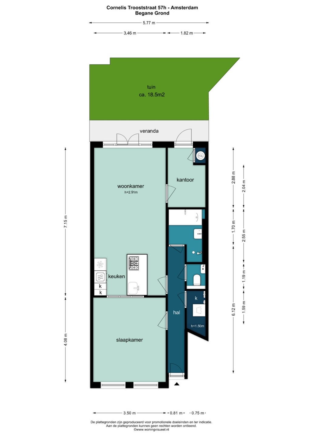 Het woonoppervlak is opgemeten conform meetinstructies gebruikmakende van de NEN2580. De Meetinstructie is bedoeld om een meer eenduidige manier van meten toe te passen voor het geven van een indicatie van de gebruiksoppervlakte. De Meetinstructie sluit verschillen in meetuitkomsten niet volledig uit, door bijvoorbeeld interpretatieverschillen, afrondingen of beperkingen bij het uitvoeren van de meting. Alle opgegeven maten en oppervlaktes zijn derhalve indicatief.