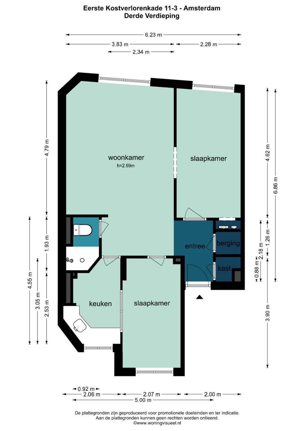 Toegang tot het appartement via het gemeenschappelijke trappenhuis naar de derde verdieping. Aan de voorzijde bevindt zich de lichte woonkamer met fraai uitzicht over de gracht. De keuken is separaat gesitueerd en naar eigen inzicht te moderniseren of te verplaatsen. Twee kamers aan de achterzijde bieden flexibiliteit in gebruik: van twee slaapkamers tot een combinatie van slaap- en werkkamer.