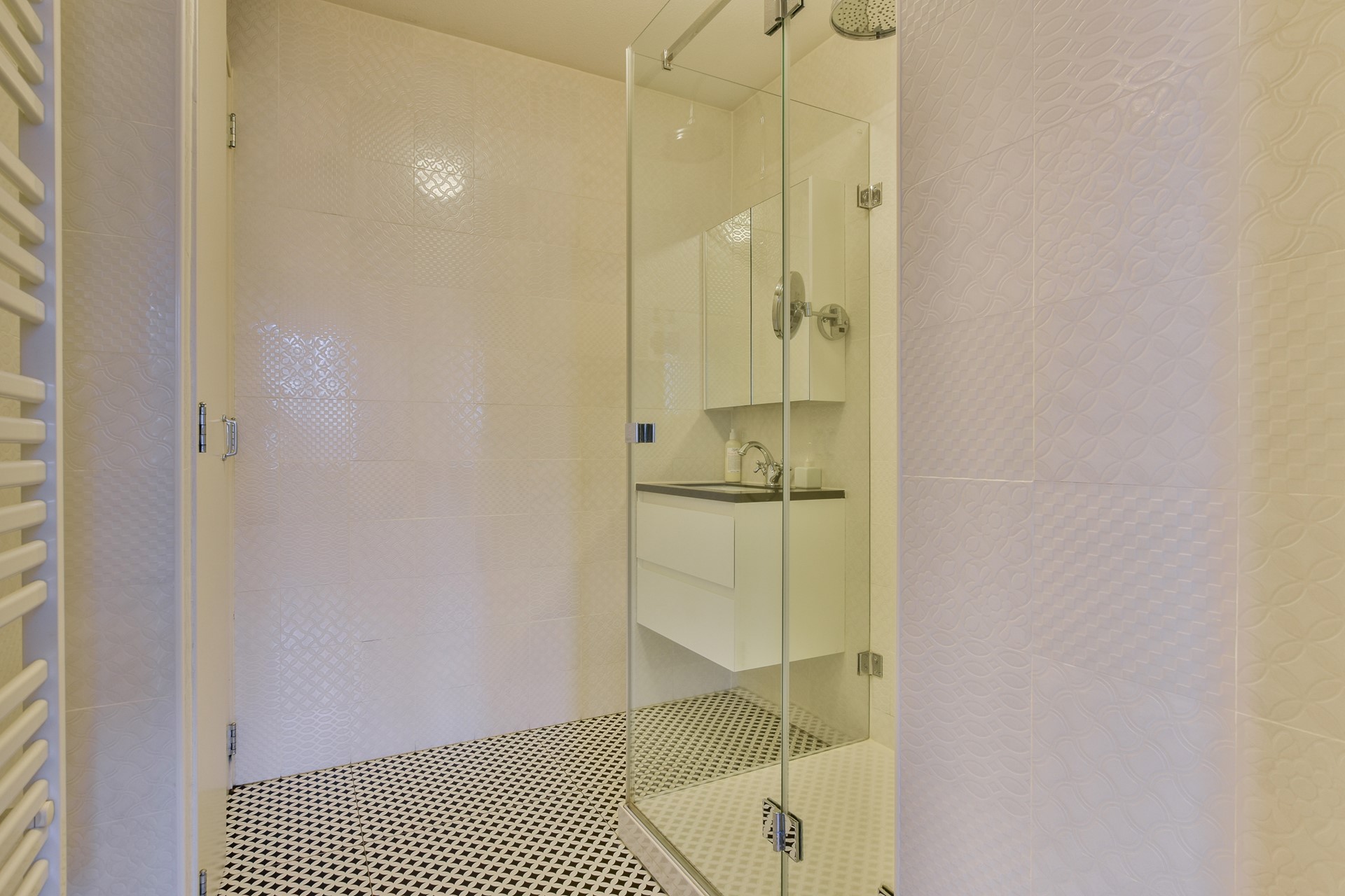 De slaapkamers zijn beide bereikbaar middels de centraal gesitueerde hal en gelegen aan de voorzijde van het appartement. Met name de ouderlijke slaapkamer is royaal van formaat en biedt meer dan voldoende ruimte voor een tweepersoonsbed en een kastenwand of thuiswerkplek. De tweede slaapkamer is momenteel ingedeeld als kastenkamer, voorzien van fraaie maatwerk kasten, maar kan tevens ideaal als werkkamer of kinderkamer dienen. De badkamer, eveneens bereikbaar via de hal, beschikt over een modern wastafelmeubel, inloopdouche, opstelling voor wasmachine en droger en handdoekradiator. Verder vindt u in de hal voldoende ruimte voor jassen en schoenen, evenals een separaat toilet met fonteintje.