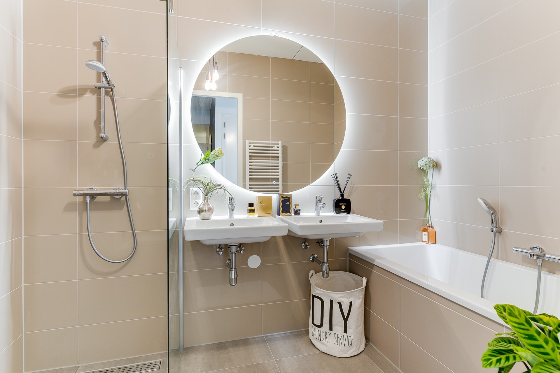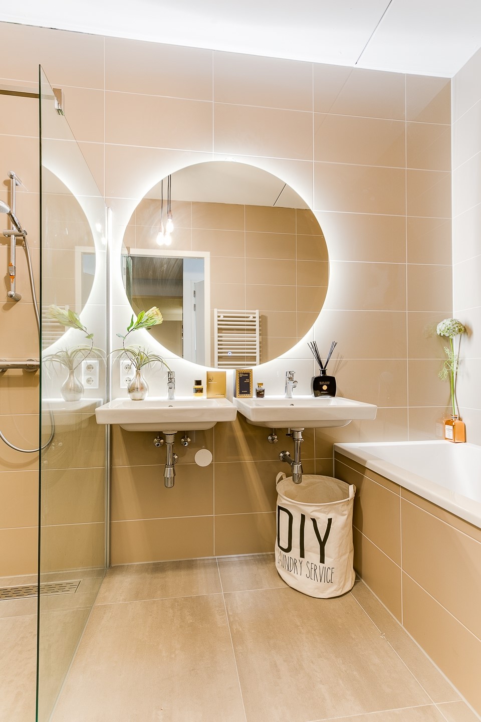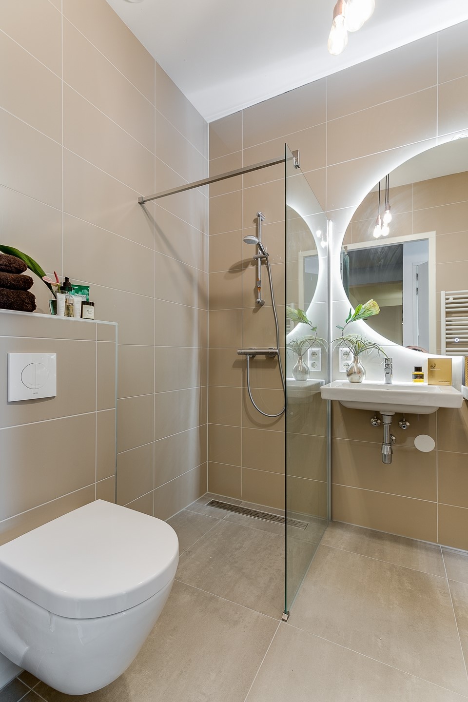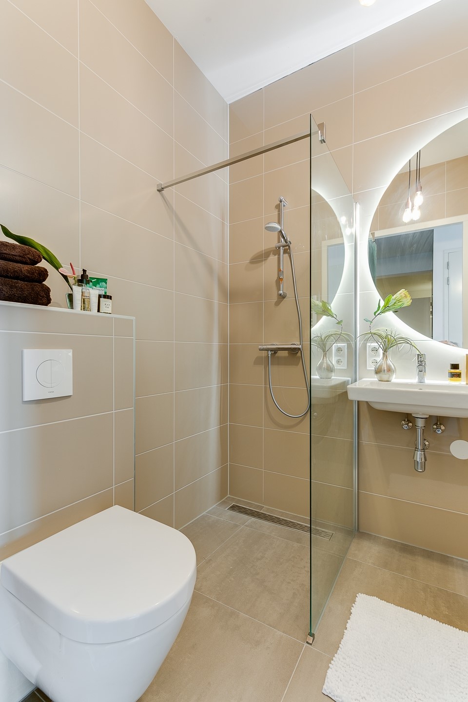 The bathroom is luxuriously finished, featuring a bathtub, double washbasin, walk-in rain shower, second toilet and underfloor heating. A separate guest toilet is also present.