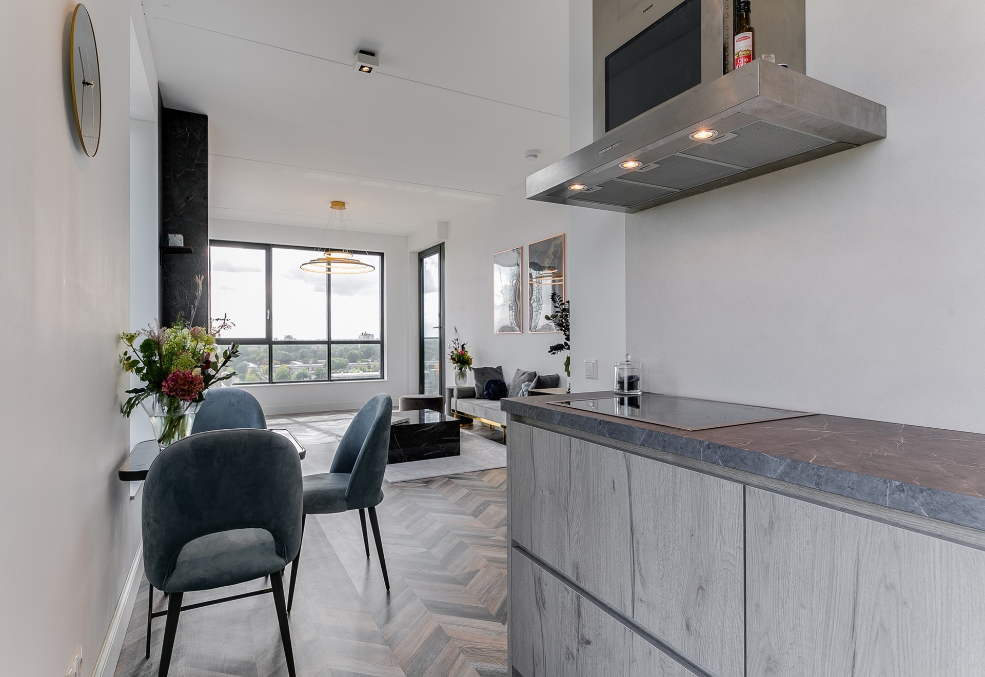 The open kitchen is seamlessly integrated into the living space and equipped with built-in appliances including an induction hob, refrigerator, freezer, combi oven/microwave and steam oven.