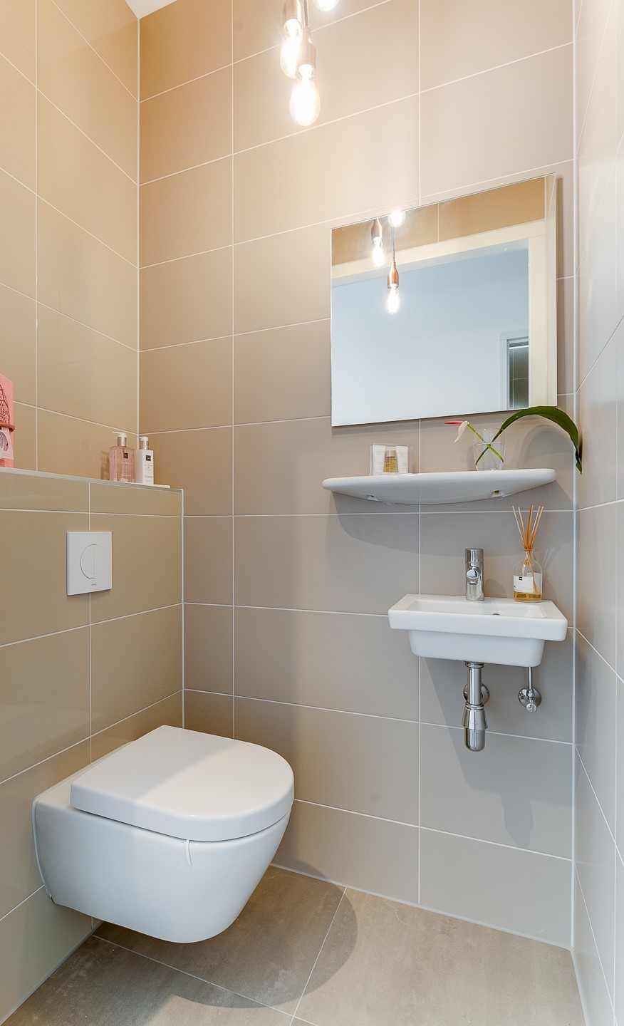 Aansluitend ligt de luxe badkamer, uitgevoerd met ligbad, dubbele wastafel, inloopdouche met regendouche, tweede toilet en vloerverwarming. Daarnaast is een separaat gastentoilet aanwezig.