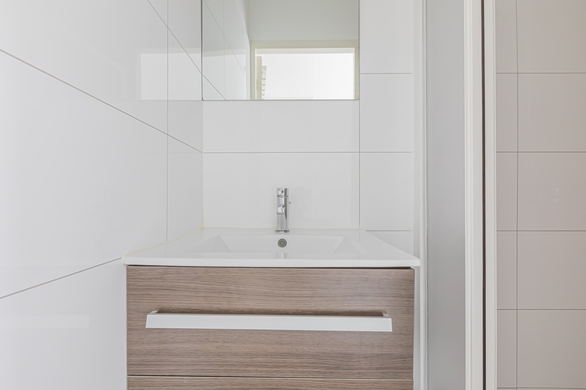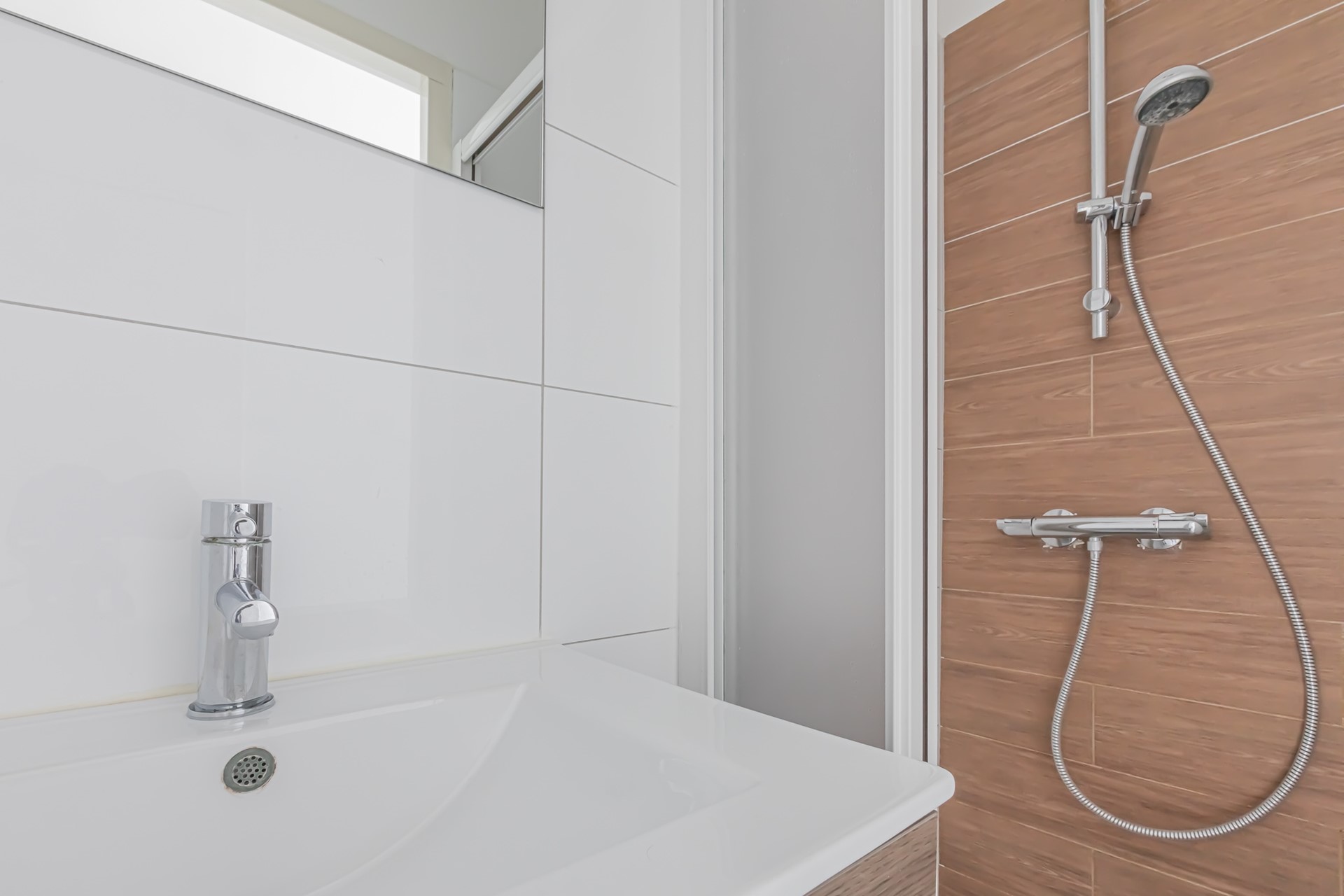 The hallway provides access to the bathroom with a washbasin and walk-in shower. There is a separate toilet and a utility closet housing the central heating system and washing machine connection.