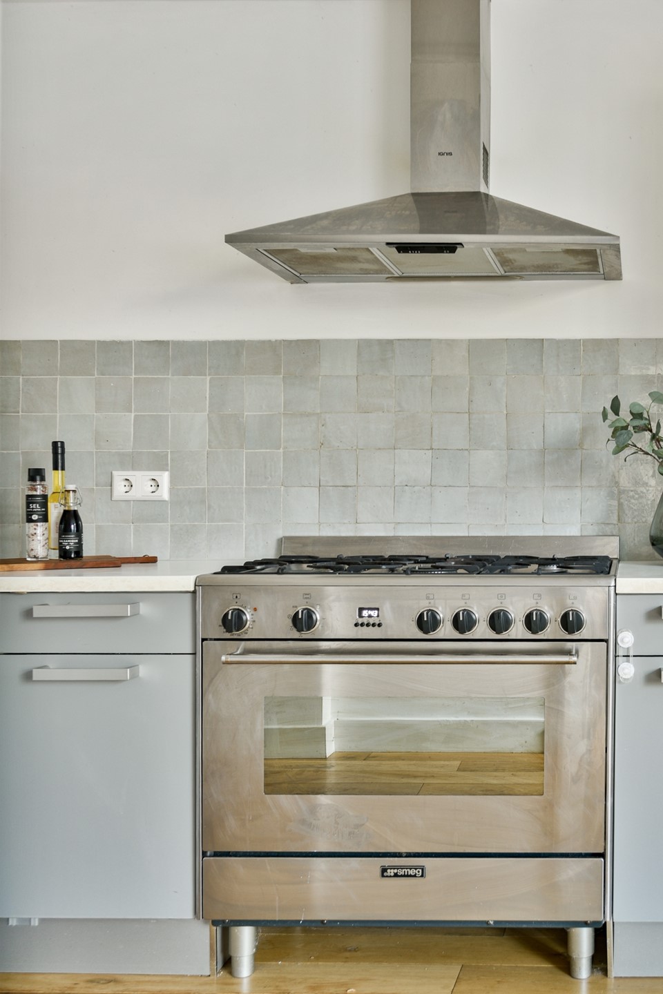 Via de eigen entree betreedt u de woning. De hal geeft toegang tot de lichte woonkamer met open keuken, die is uitgerust met diverse inbouwapparatuur, waaronder een 5-pits gaskookstel, koel-vriescombinatie, Smeg oven en vaatwasser. Een fijne, open leefruimte waar koken en wonen moeiteloos samenkomen.