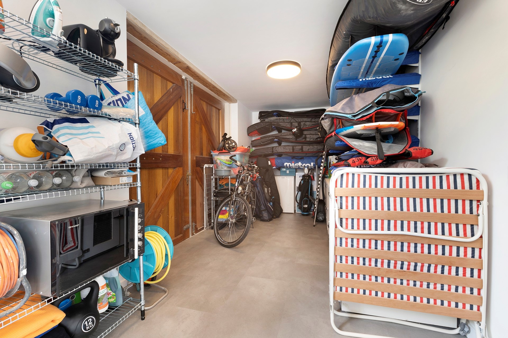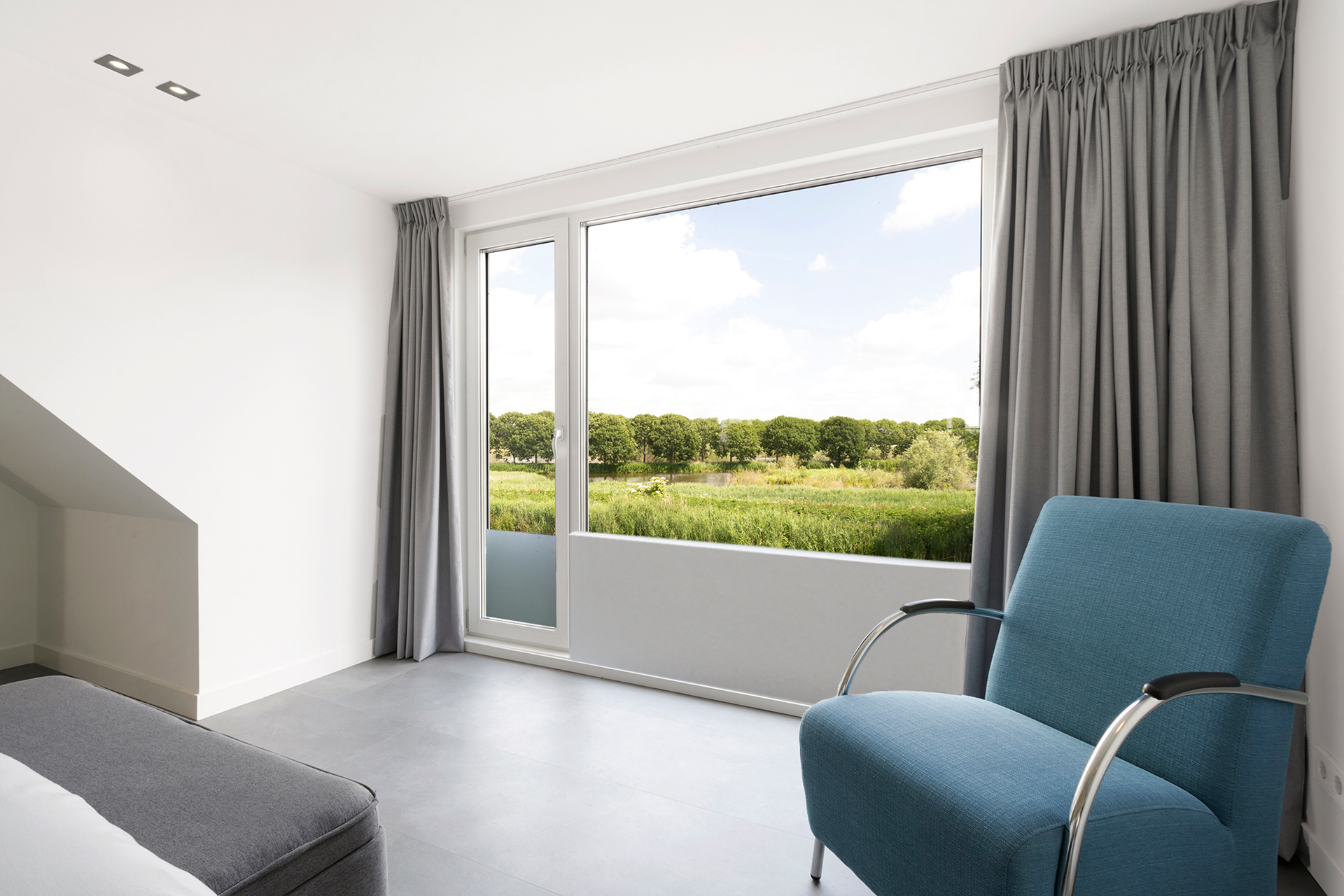The entrance leads into a spacious hallway with a separate toilet. At the rear, you will find the generous living room with French doors opening onto the terrace, from where you can enjoy stunning views of the water and surrounding nature. The living room features a stylish herringbone floor. The luxurious open kitchen is equipped with a cooking island including Bora, an induction hob, oven, dishwasher, and a fridge with freezer. On the side, there is a practice room or additional bedroom with its own shower and toilet, accessible both from the living room and via a private entrance. The indoor storage room offers ample space and is fitted with connections for a washing machine, dryer, and an electric car charging point.