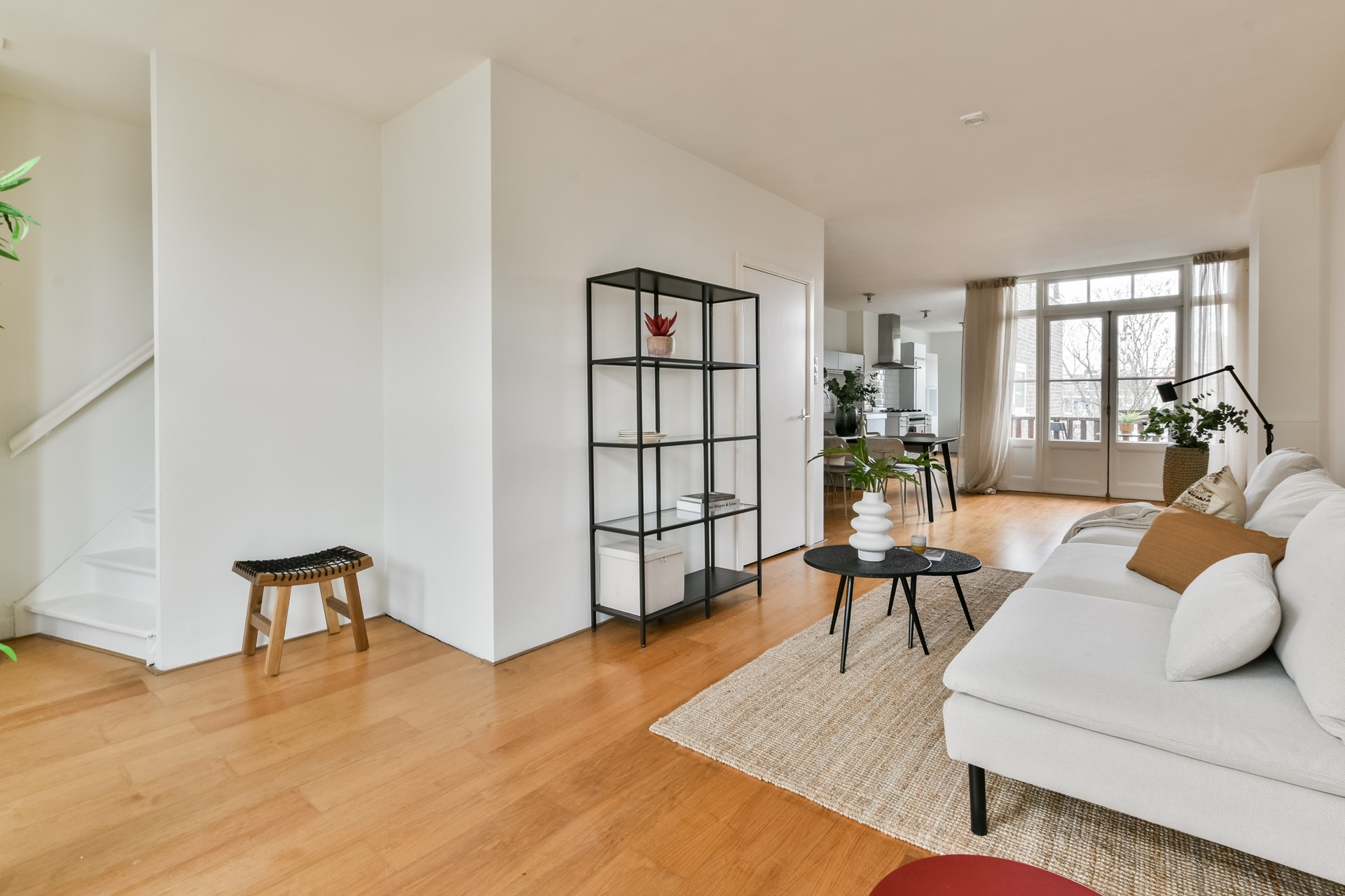 Aan de voorzijde ligt de woonkamer met vier raampartijen op het Zuiden die gedurende de dag veel licht doorlaten. ’s Middags komt de zon hier prachtig naar binnen schijnen.