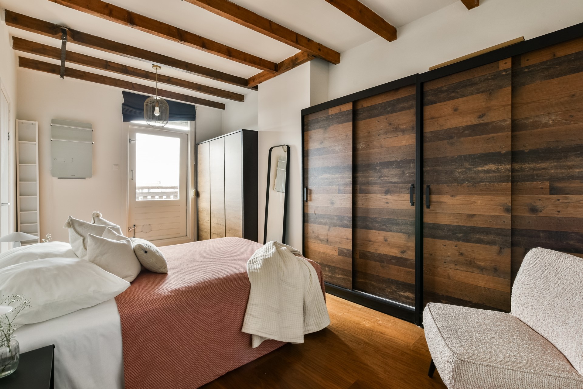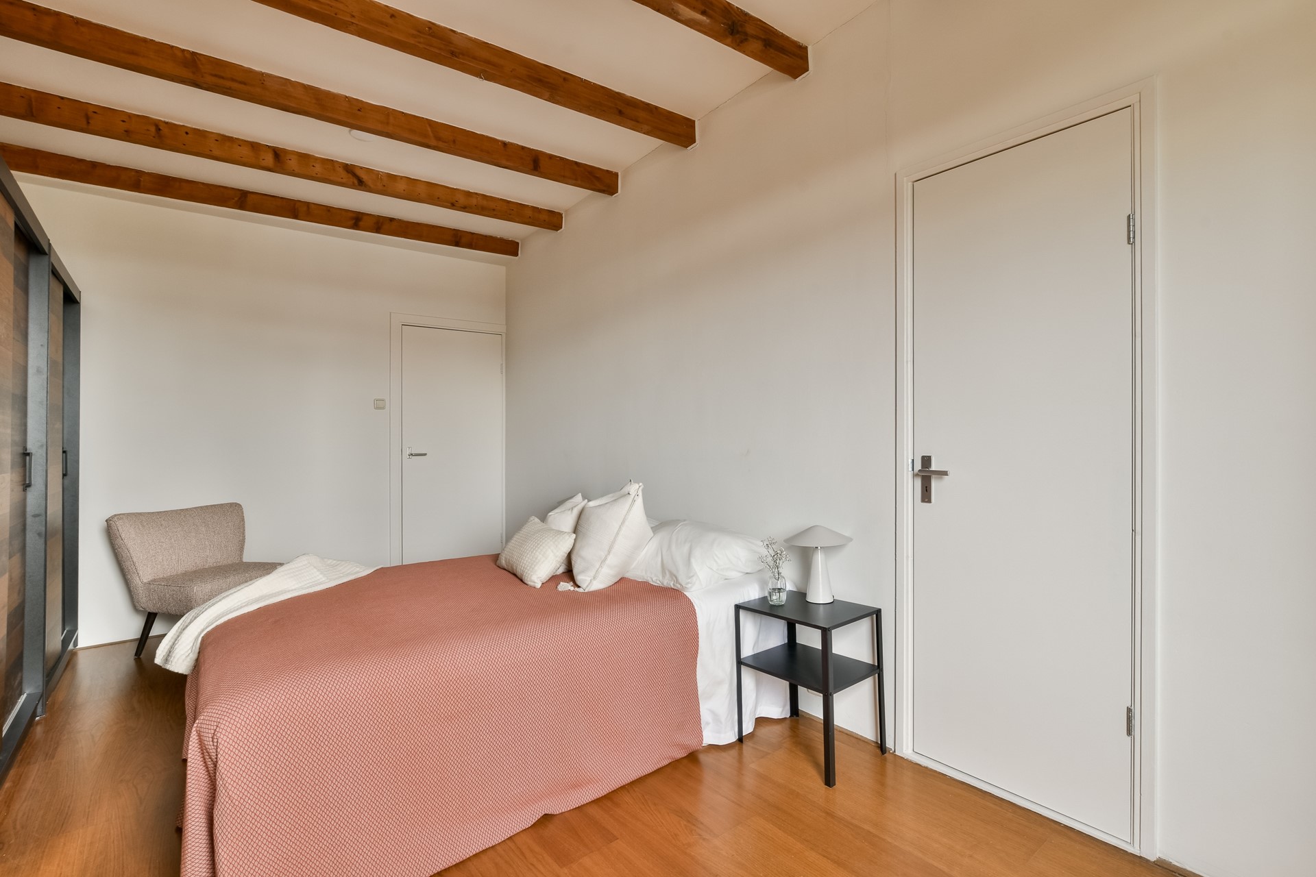 De hoofdslaapkamer is gelegen aan de achterzijde en heeft toegang tot het dakterras van ca. 14m2. Het dakterras is rustig gelegen en heeft veel privacy.