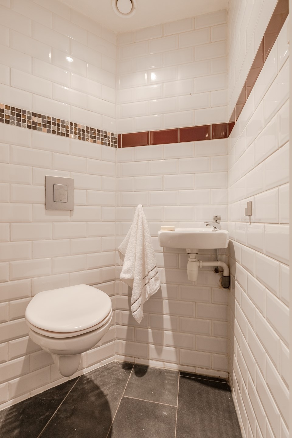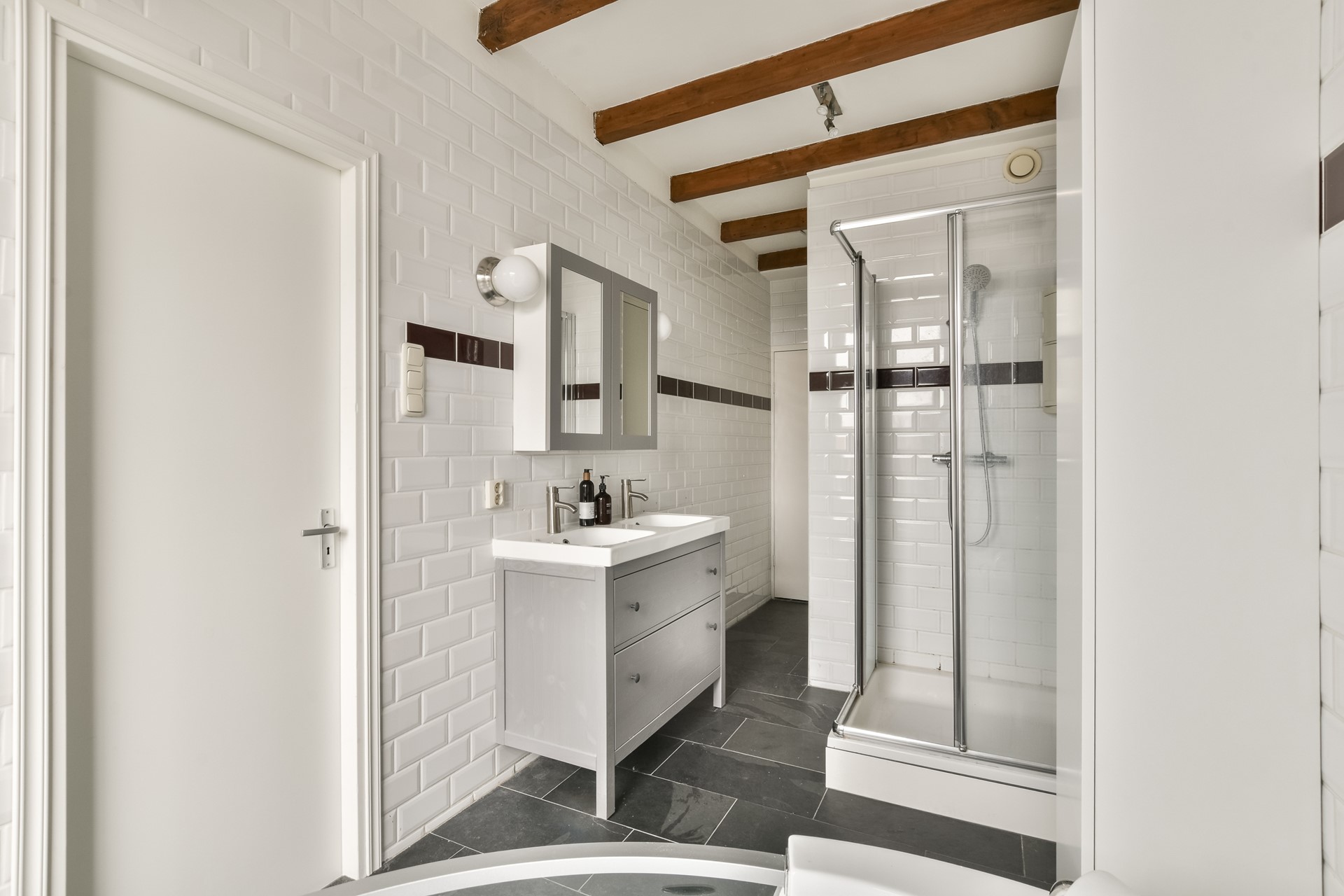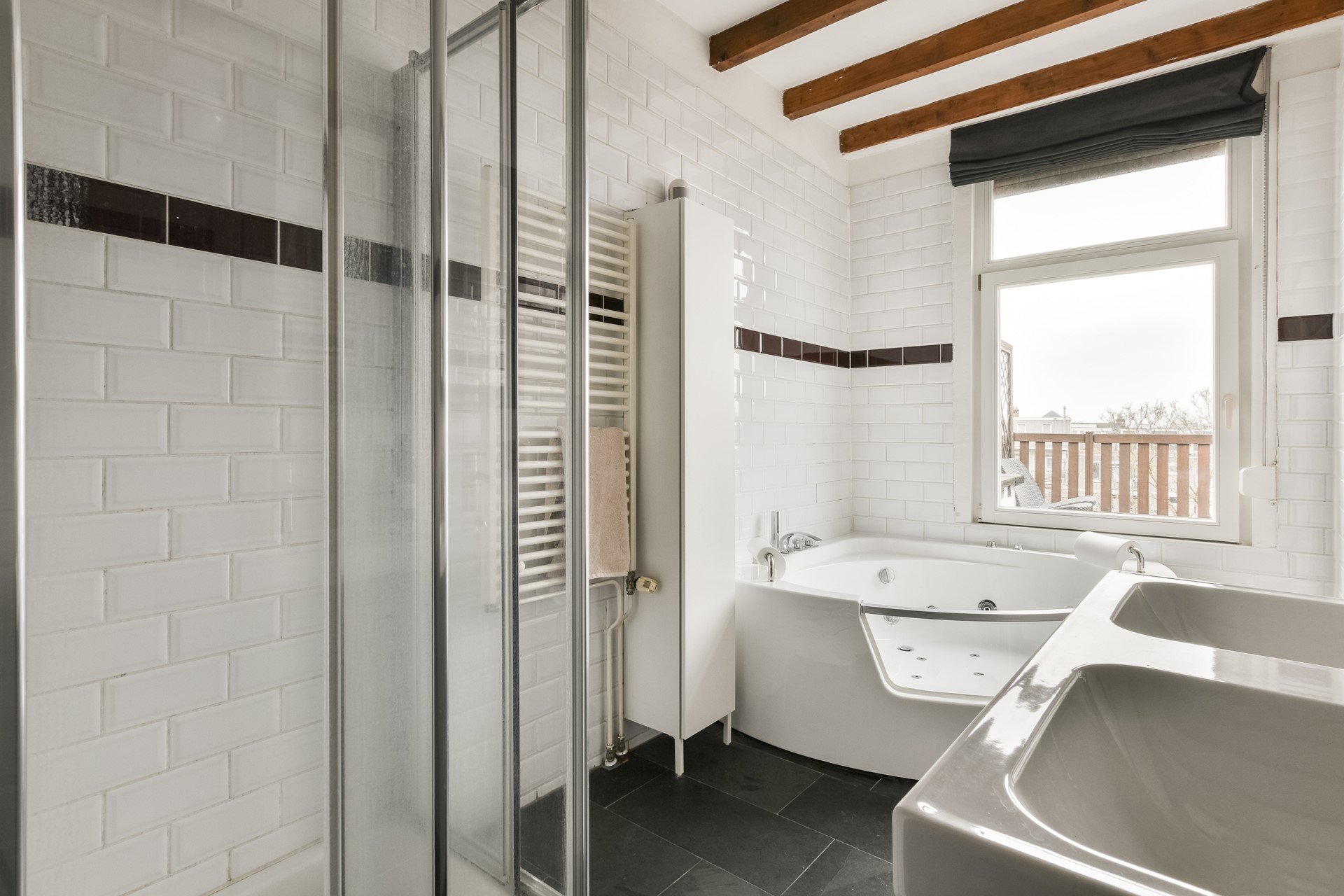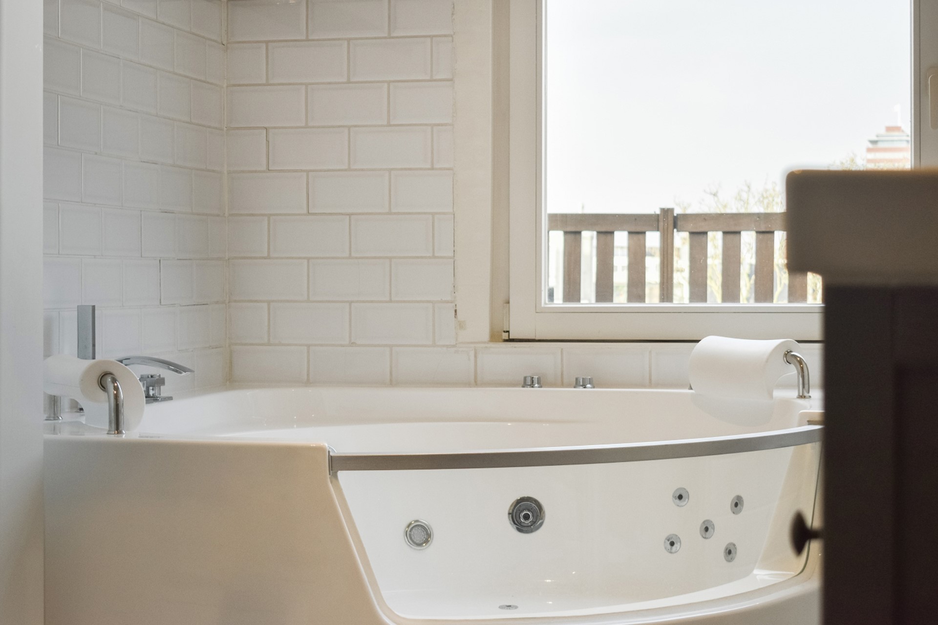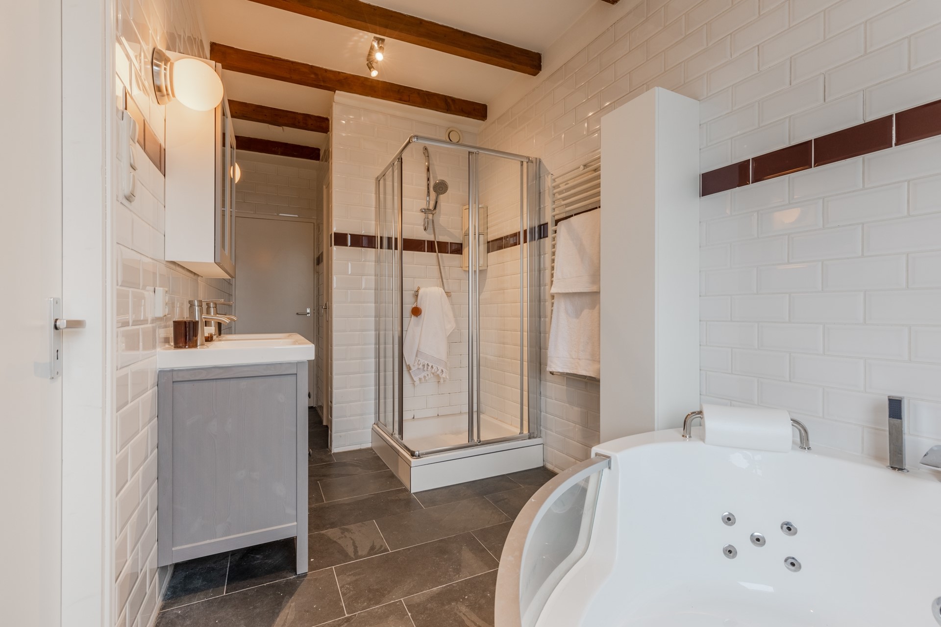 De naastgelegen ruime badkamer is voorzien van een groot ligbad met jets, aparte douche, dubbele wastafel en een separaat toilet.
