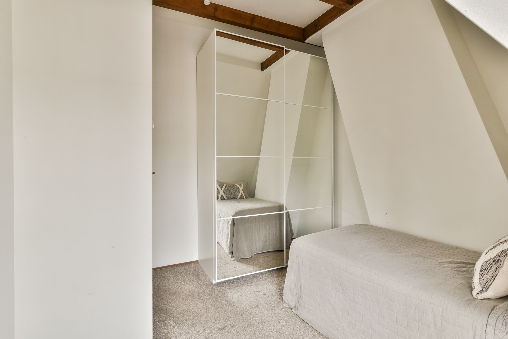 Aan de voorzijde van de woning is de 2e slaapkamer gelegen. De mogelijkheid bestaat om deze te vergroten door de muur naar de berging te verwijderen.