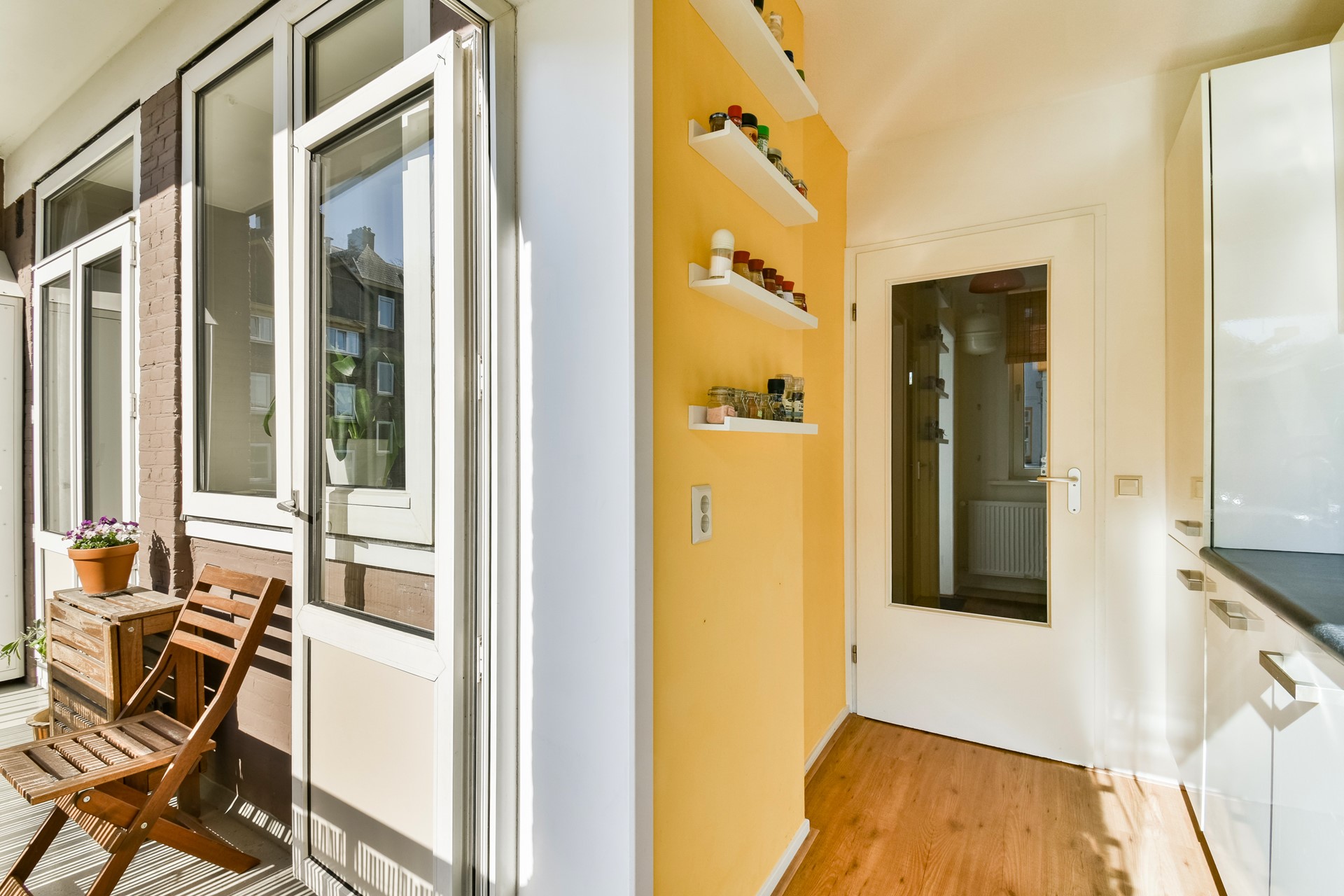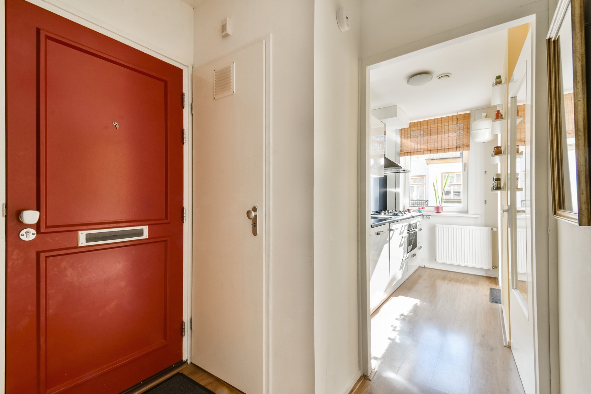 Via de portiek bereik je de entree van het appartement op de eerste verdieping. De hal vormt het centrale punt van de woning en biedt toegang tot alle vertrekken. Aan de achterzijde bevinden zich de keuken, voorzien van diverse inbouwapparatuur, en de ruime slaapkamer. Vanuit de keuken en slaapkamer krijg je toegang tot het zonnige balkon gelegen op het zuiden.