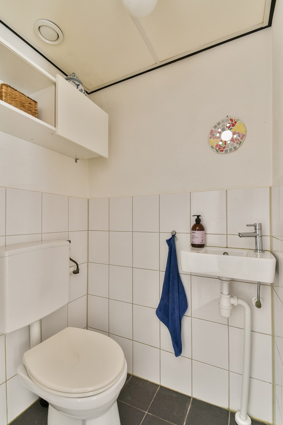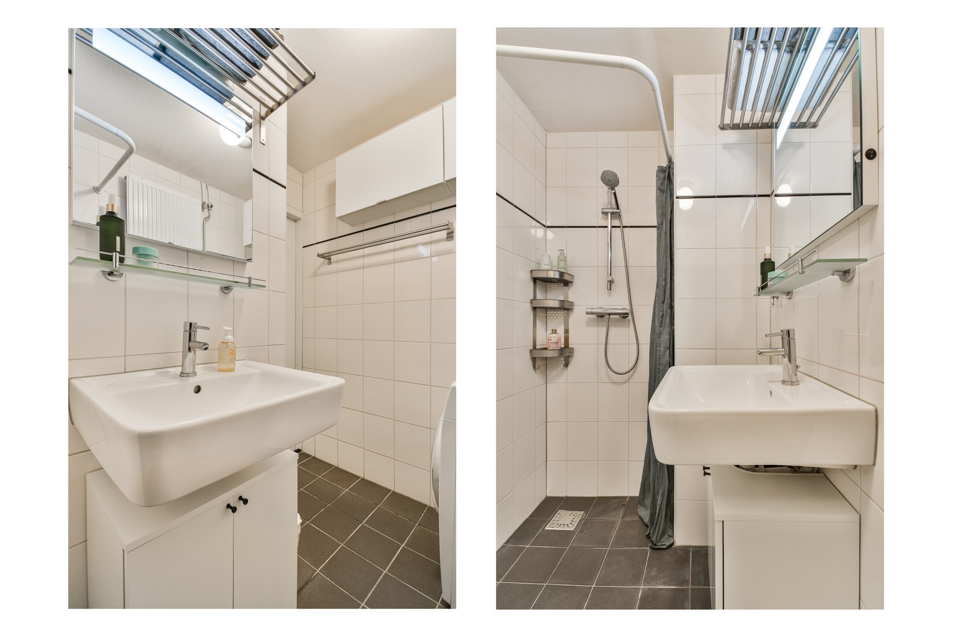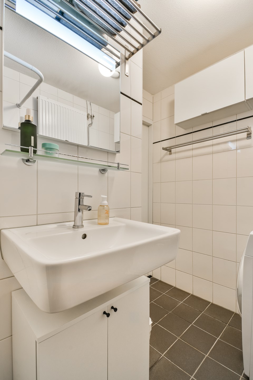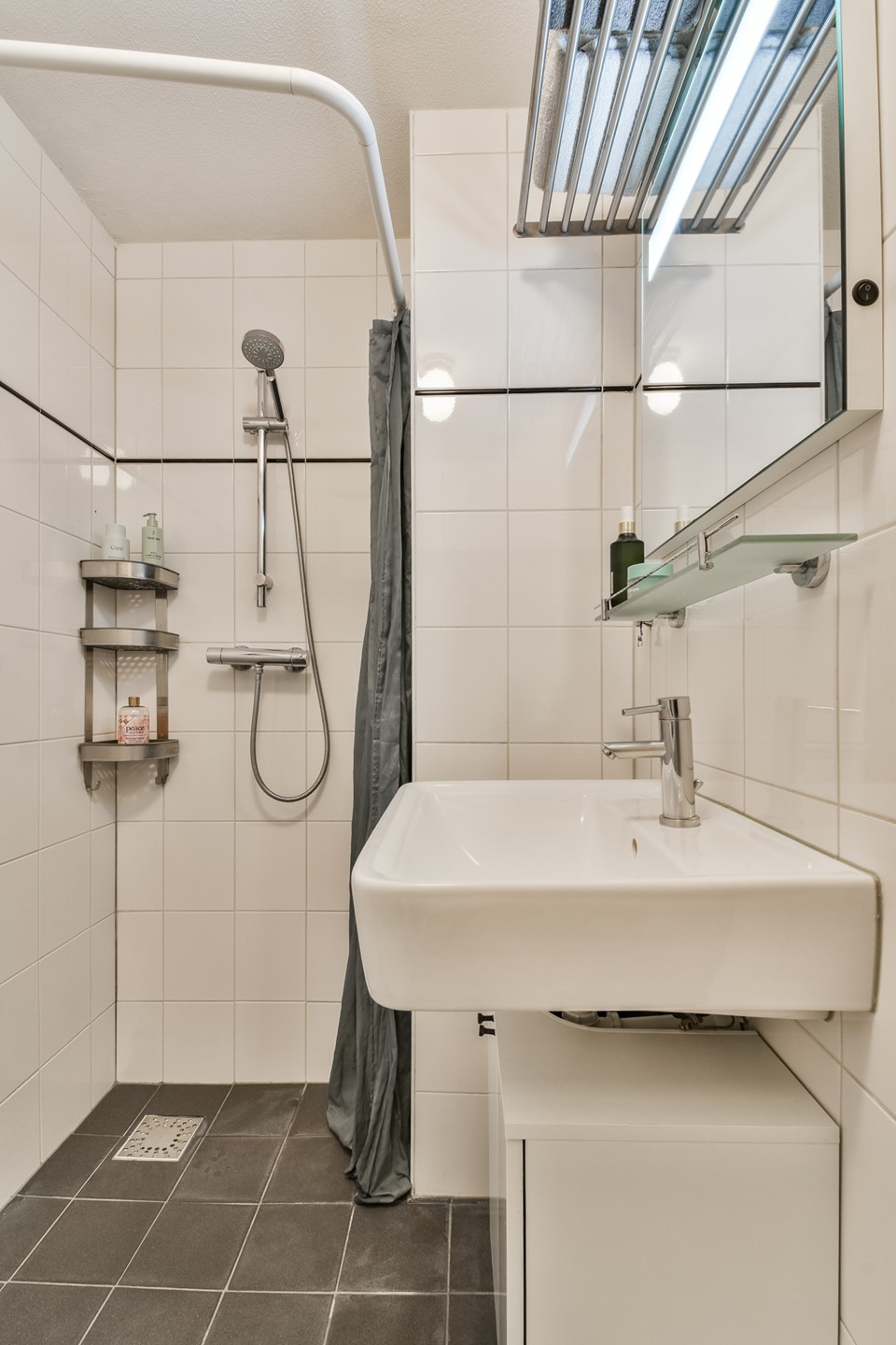 In het midden van het appartement zijn het separate toilet en de badkamer gesitueerd. De badkamer is voorzien van een inloopdouche, een wastafel en een aansluiting voor de wasmachine.