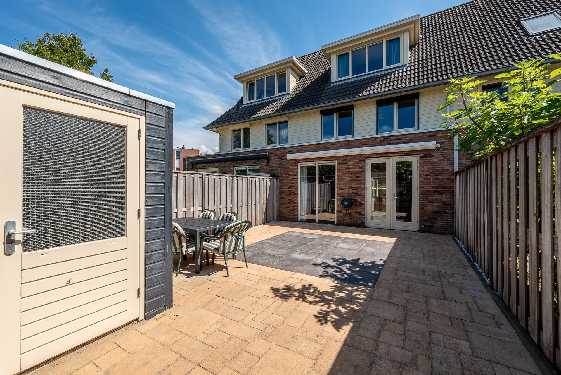 De woning beschikt over zowel een voor- en een achtertuin. De achtertuin, met een achterom, is heerlijk diep te noemen, is voorzien van een stenen berging en biedt volop mogelijkheden voor verschillende zitplekken, speelruimte of een groene inrichting. De achtertuin is op het Noord-Westen gelegen, zon in de namiddag en vroege avonden.