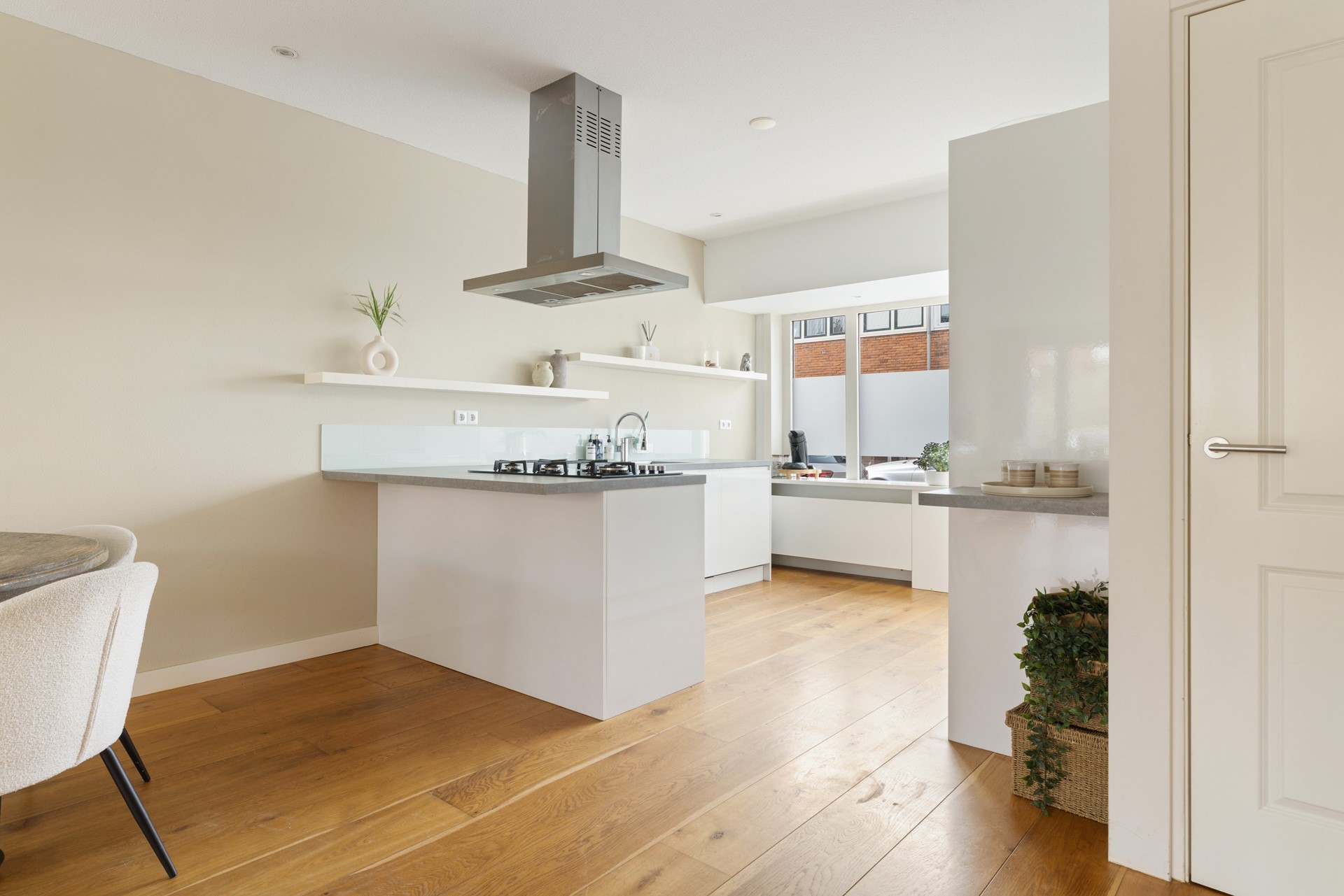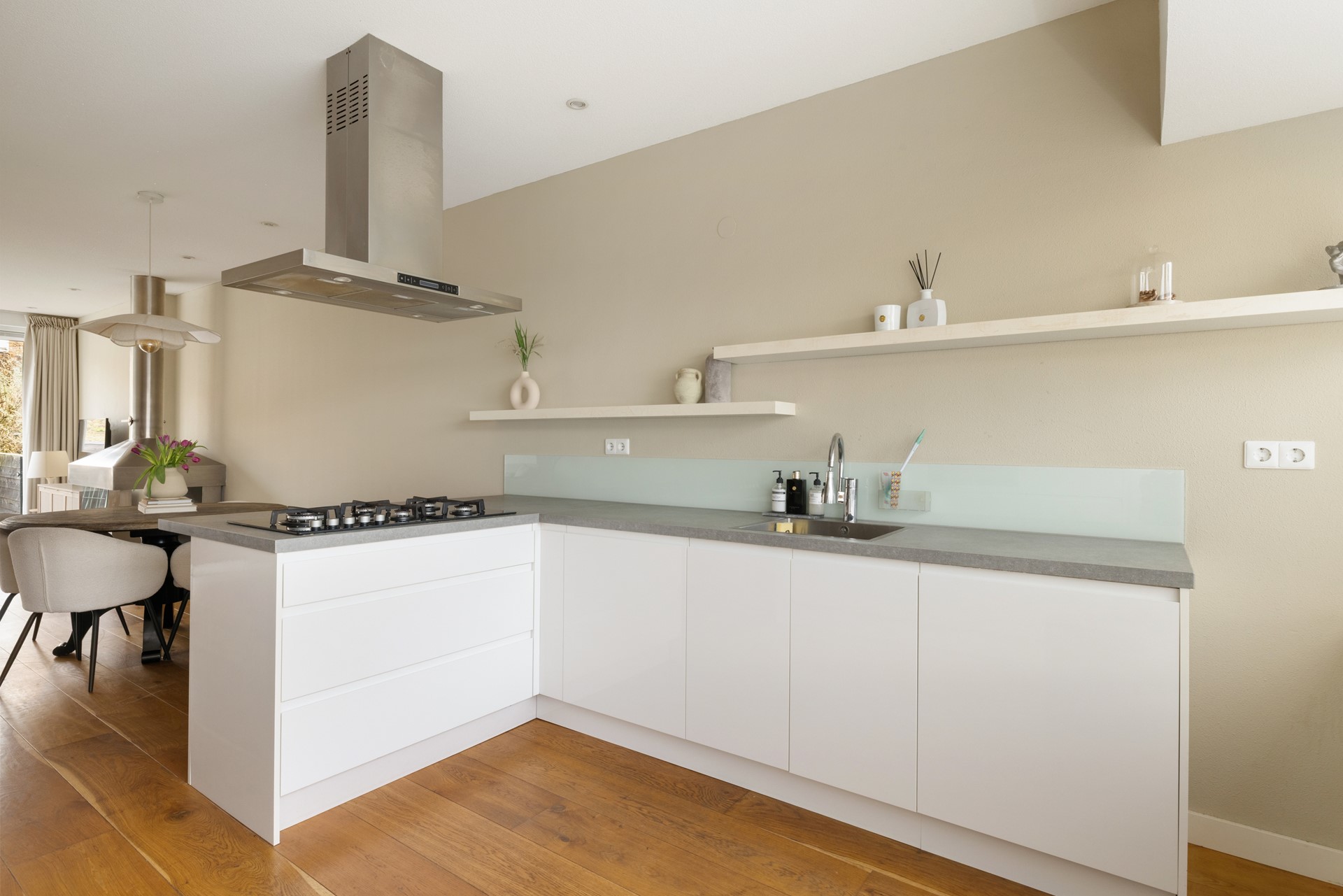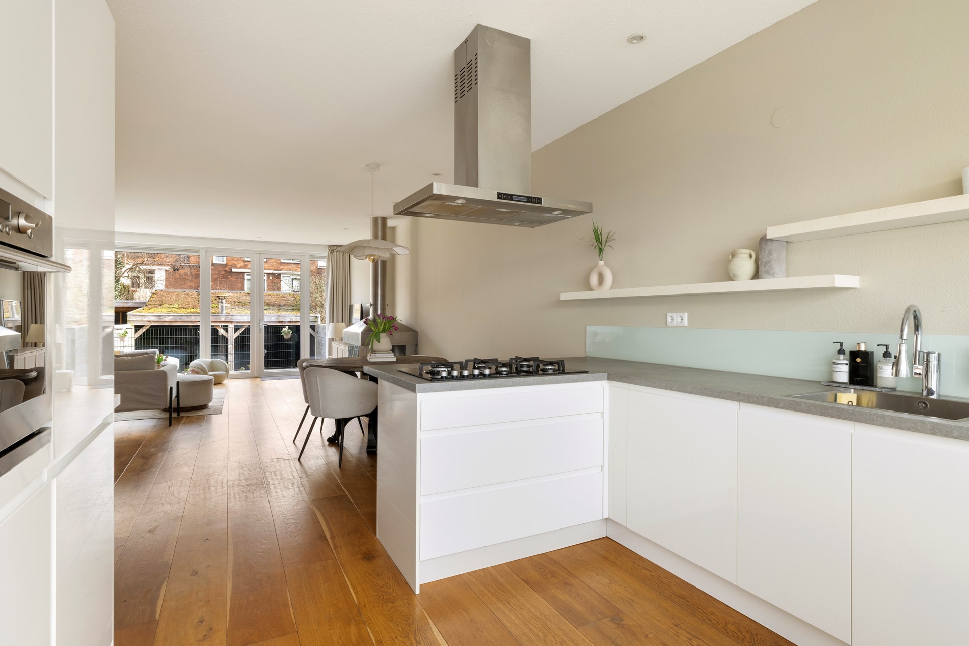 De open keuken vormt het hart van de woning en is van alle gemakken voorzien, waaronder een kookeiland met alle inbouw apparatuur – ideaal voor gezellige avonden met familie en vrienden.