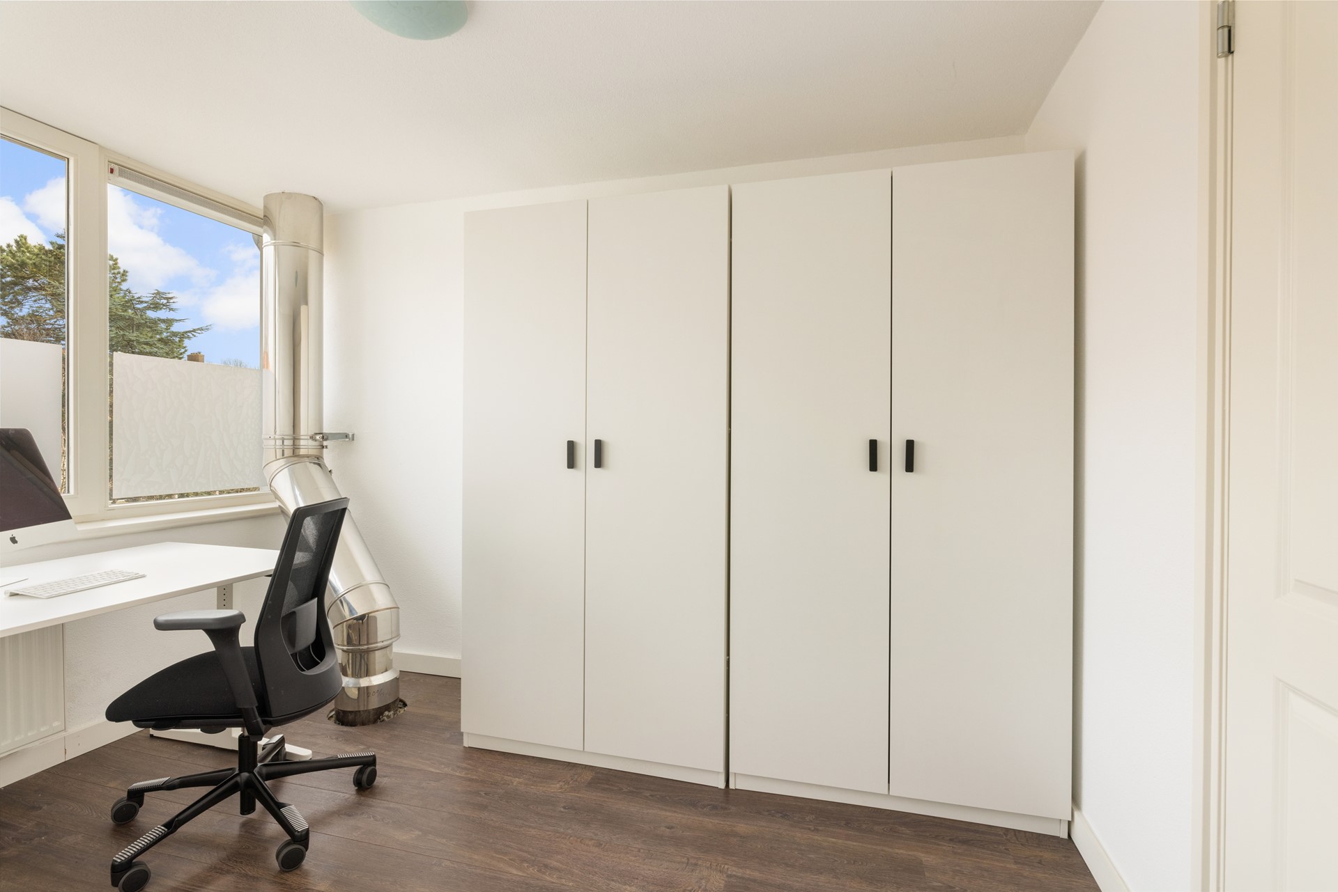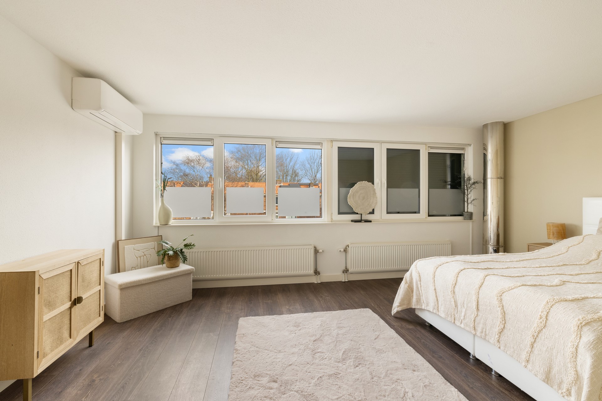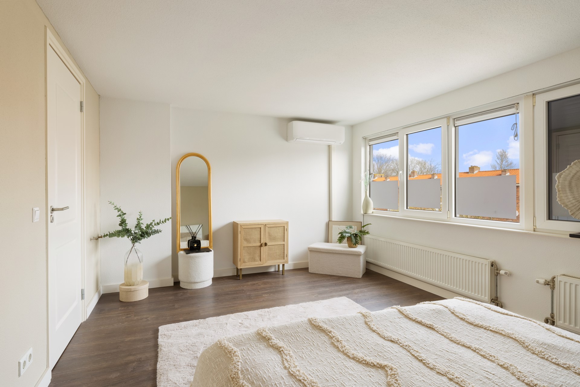 Large windows provide an abundance of natural light, enhancing the sense of space and openness throughout the home. The wooden flooring adds warmth and a timeless feel, forming a perfect base for any interior style. The property is well maintained, contributing to a comfortable and modern living environment.